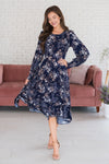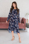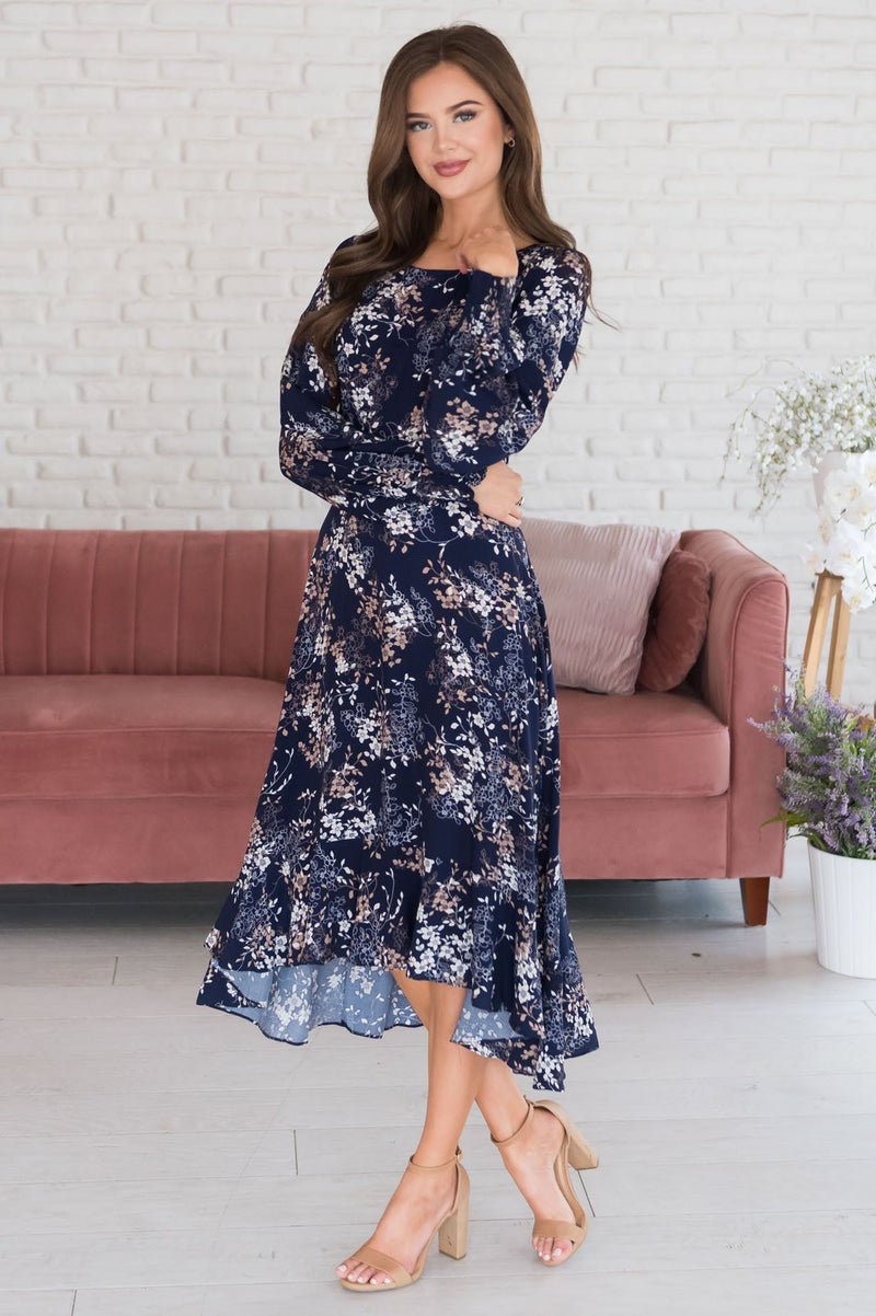 We just got your new favorite modest dress in! Featuring the perfect midi length, a gorgeous navy color with ivory and beige floral throughout, long sleeves with an elastic hem, and a hi-low skirt! This gorgeous dress won't last long, get yours soon!
