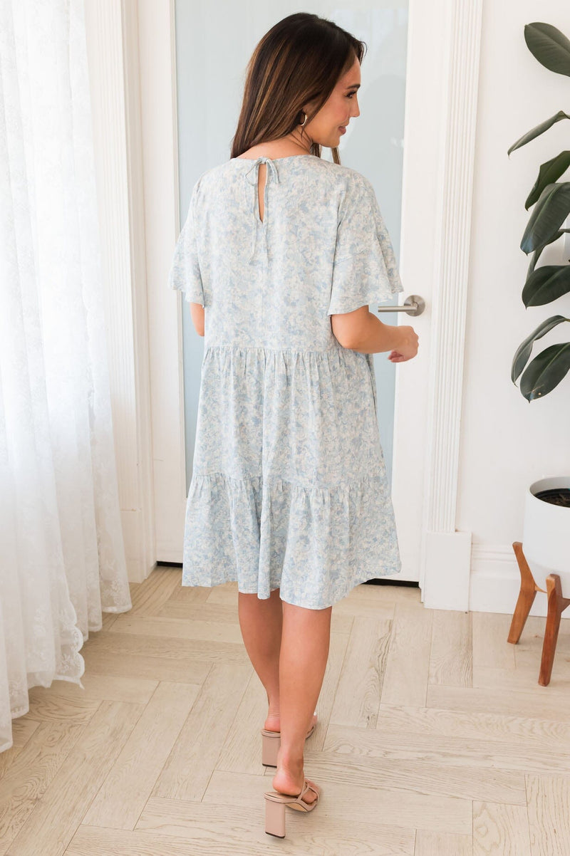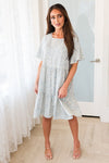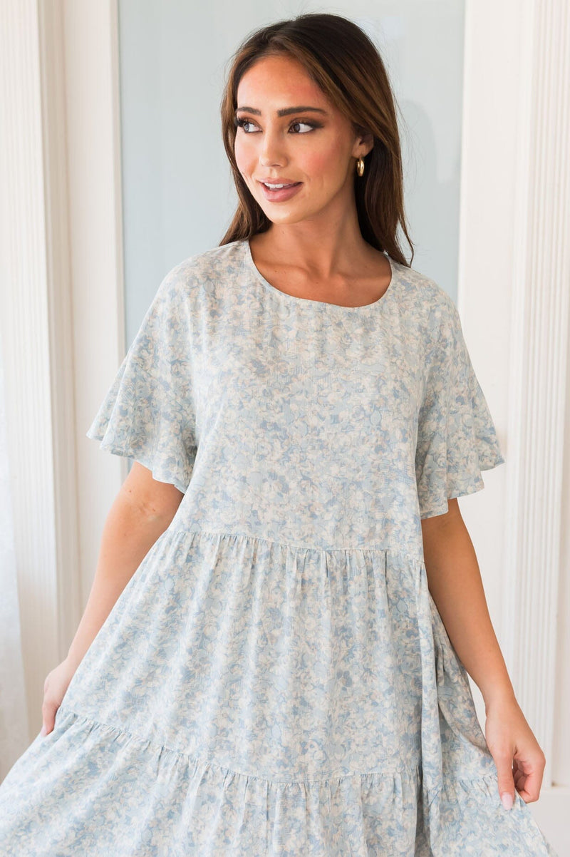 Be prepared to be amazed! This darling Roselinda dress is so flattering and fun! Featuring the most gorgeous dusty blue & Ivory floral combo, modest round neckline, short flutter sleeves and our most adored swing style tiered skirt. Get yours today!