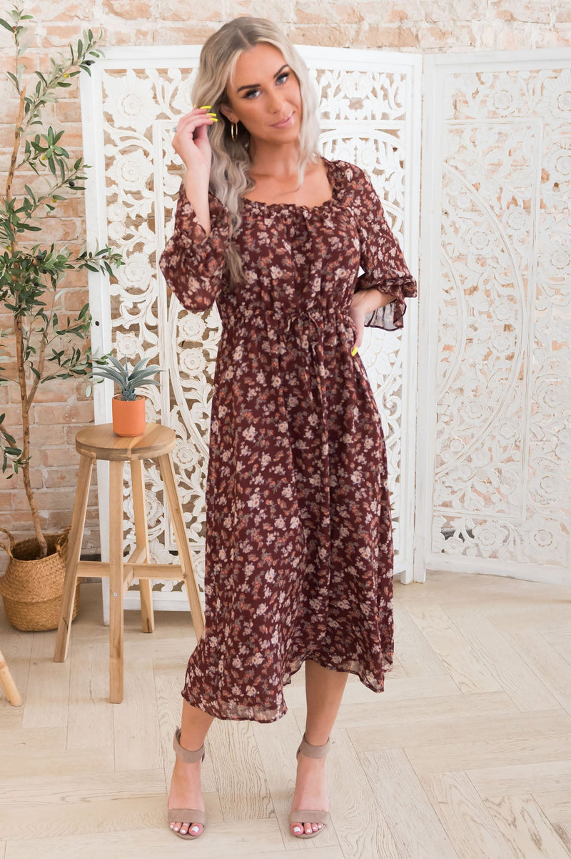 Swooning for this floral, the lovely new Ruthann is the absolute perfect dress for all! Features include 3/4 length puff sleeves, rounded modest neckline, elastic waistline and gorgeous flowy skirt. Get yours today before they're gone for good!