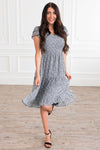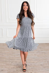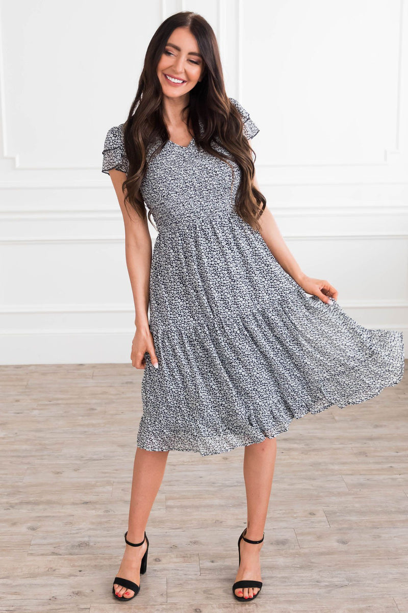 The Rylin dress is lovely in absolutely every way! The ruffled sleeves and tiered skirt is nothing short of beautiful! The smocked top not only is flattering beyond measure, but allows for a trendy modest fit! We adore this classy black and ivory floral print from top to bottom!