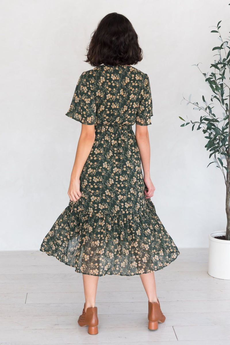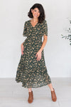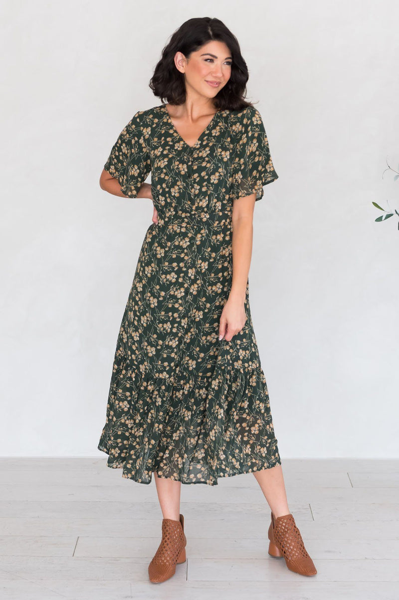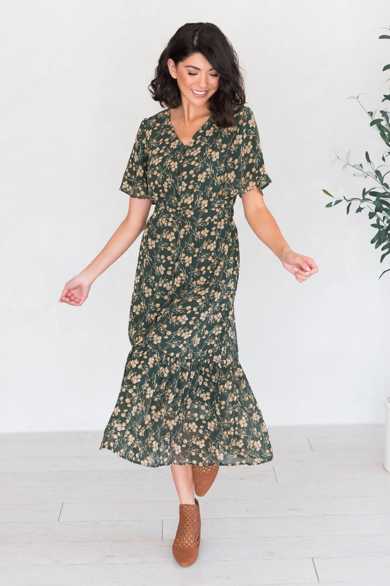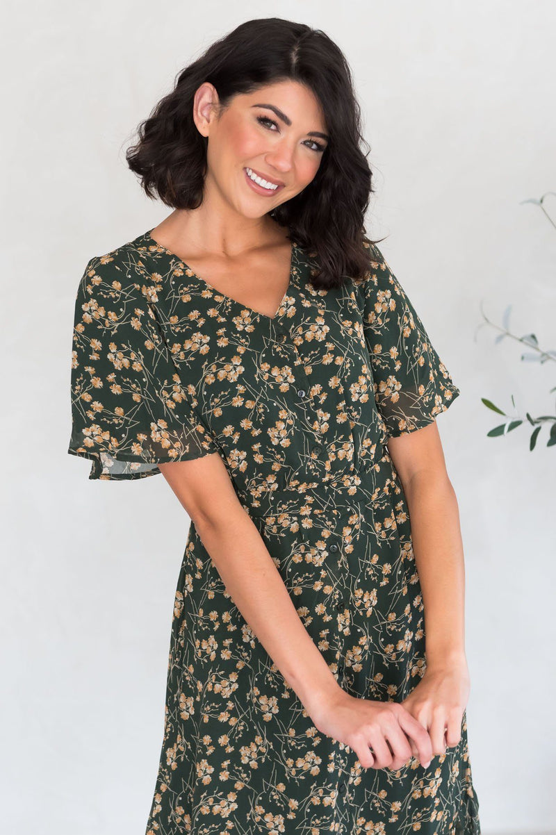 The perfect modest dress just arrived! Our new Saffron dress is a stunner and we know you all will agree! Modesty is truly at its finest with this tea length beauty. Featuring a gorgeous forest green color with golden floral print throughout, button down bodice making this one nursing friendly, adorable feminine flutter sleeves, functional buttons on the front of the skirt, and a darling ruffled hem making this dress twirl ready! The back of the dress has an elastic waistband for that perfect fit. Get yours today because trust us this one will sell out quickly!