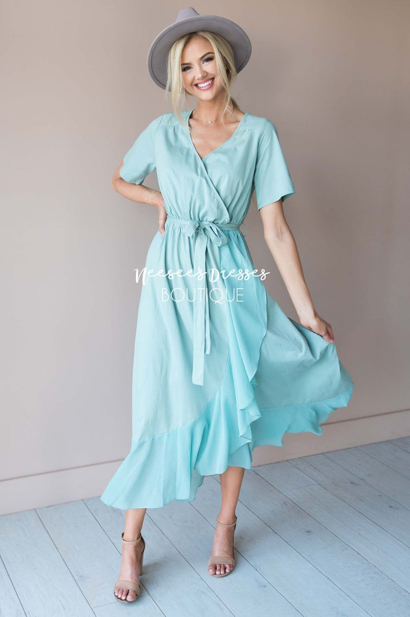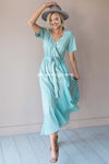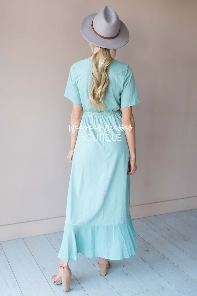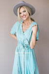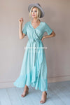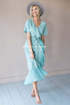 HELLO BEAUTIFUL! The Ximena is one of our new favorites! This dress features 3/4 length sleeves, a feminine v-neck top with a hidden button, which makes this dress nursing friendly! We love the elastic waistband, making it a comfortable choice for any event ! The chiffon seafoam ruffle hem detail may be our very favorite part about The Ximena! You will want to get this dress ASAP, it will not last long!