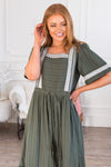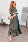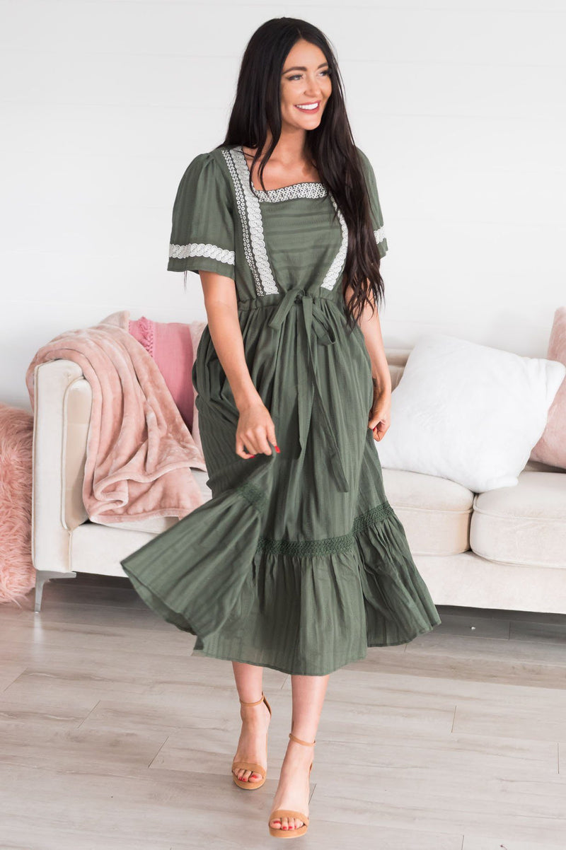 The Sandy is simply gorgeous! Featuring a gorgeous olive green color, ivory embroidery on the bodice and sleeves, short flutter sleeves, elastic waist with a belt tie, and the perfect modest tea length skirt with lace embroidery! Make sure to get yours soon!