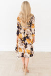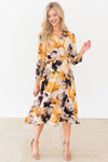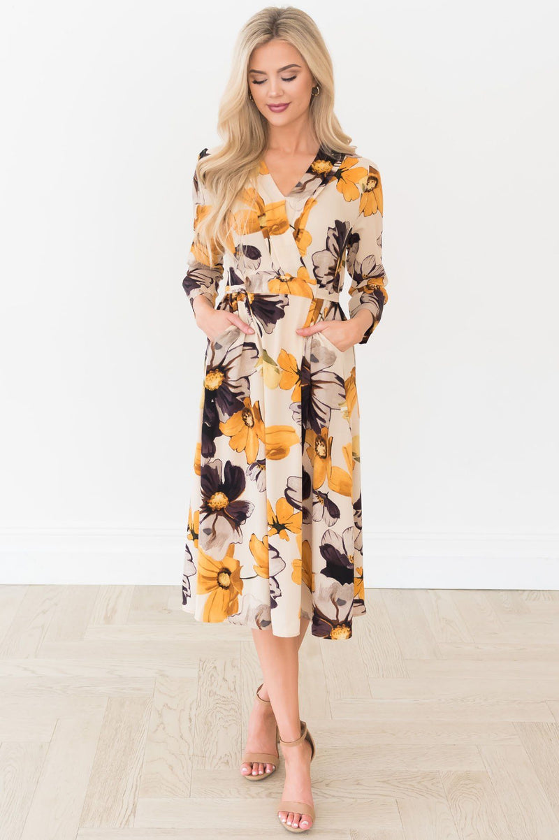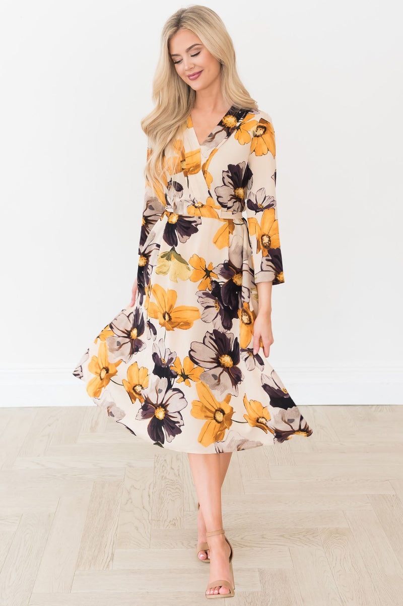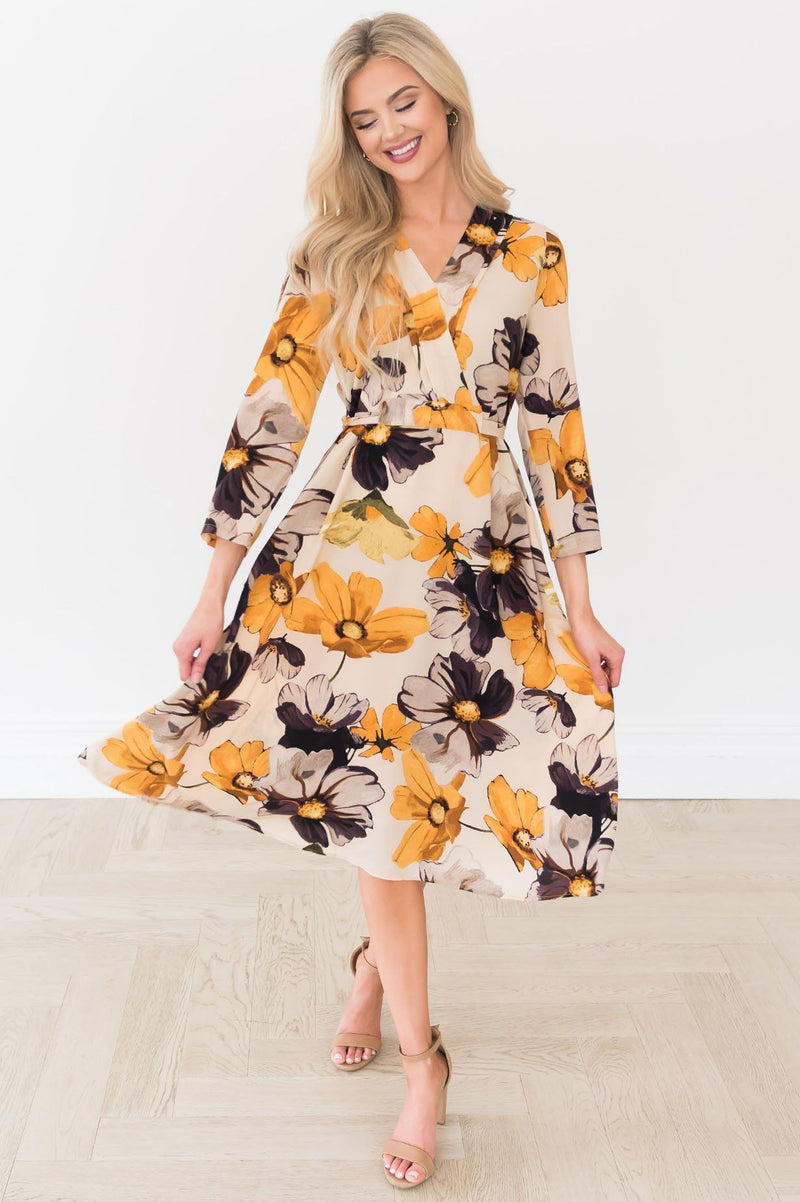 Lets talk about this absolutely radiant colorway and floral print! This trendy and modest fit is flattering beyond measure! This large floral, cross body bodice, unique tie waist, and bell skirt create and undeniably beautiful look! There is a functional zipper on the right side of the dress.