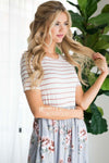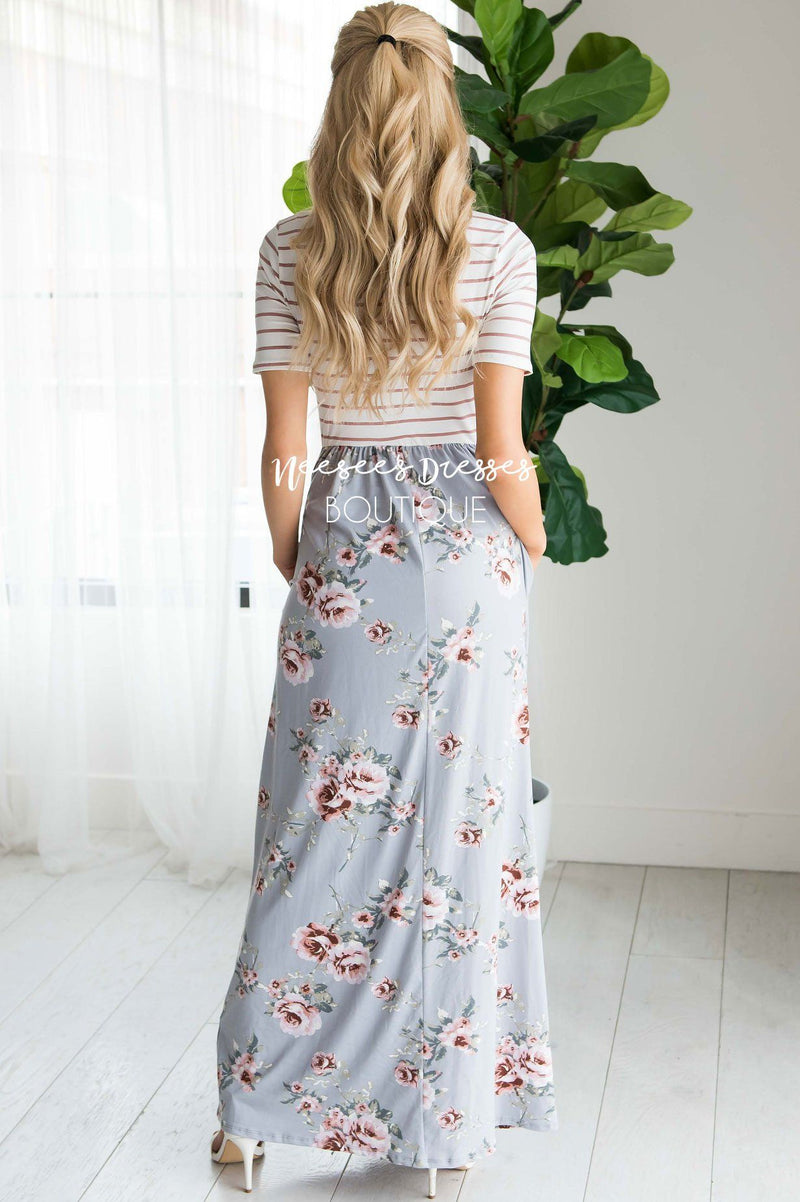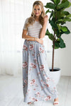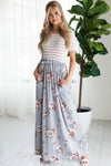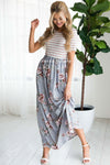 When beautiful meets comfortable, The Sasha is oh so pretty! This maxi dress will leave you feeling beautiful for any fall occasion! Featuring pink and ivory striped bodice and followed by a gathered waist and light gray maxi skirt with a floral print.