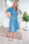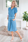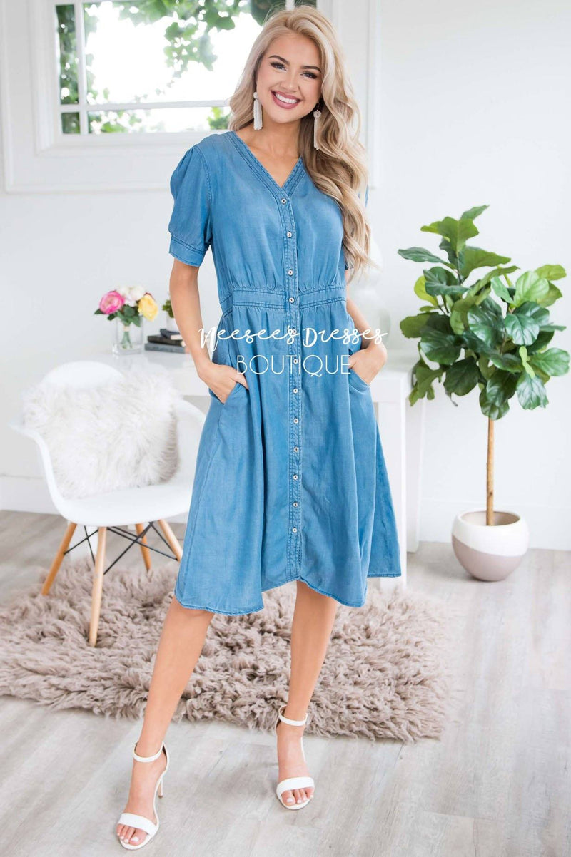 This timeless dress is a must have for spring fun! Dress is up with your favorite accessories and heels or keep it casual with your favorite sandals or sneakers, wither way you cannot go wrong with this one! Light chambray dress features a v neck line, a functional button front, puffed short sleeves a fitted waist and side pockets. This dress is also nursing friendly.
