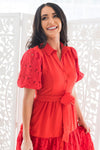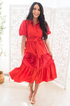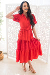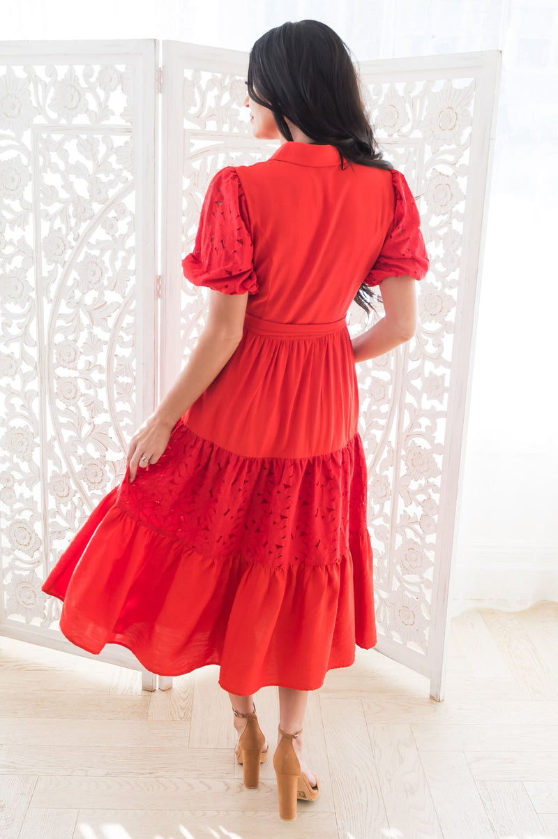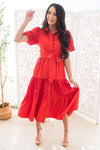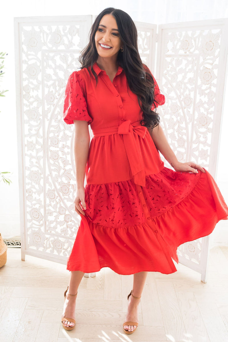 The Scarlette is truly the most gorgeous red dress we've ever seen! Featuring a gorgeous lace detailing throughtout, beautiful short puff sleeves, functional button front that makes it nursing friendly, and a tiered skirt. We truly can't get enough of this stunning dress!