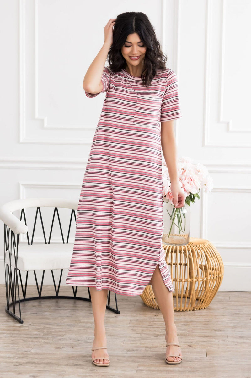 It's no secret that we love stripes! Our new Selby maxi tee dress is stunning in every way. Features include a round neckline, front pocket detail, short sleeves and flowy maxi skirt. Hurry and add to cart because this beauty will fly out of our boutique quickly!