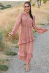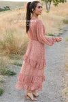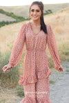 This is our newest favorite! We can not get over the stunning cinnamon color, fall floral print and all those flowy ruffles! Also features a modest lace detailed v-neckline, long cuffed puff sleeves, elastic waist and the skirt is lined.