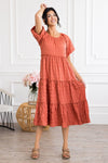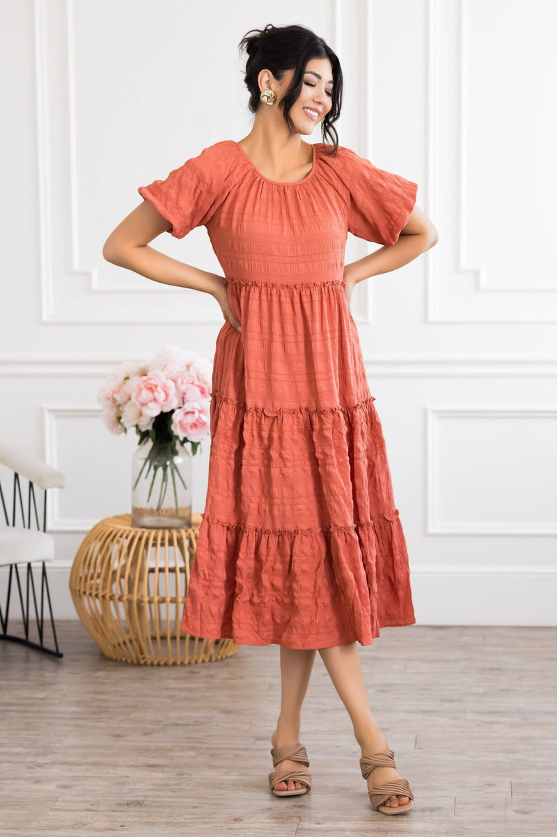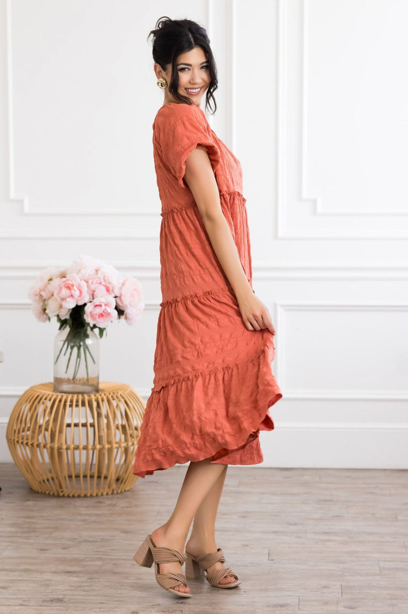The Serena modest dress is perfect from top to bottom! We adore the gorgeous paprika color, tiered skirt, high rounded neckline, and ruffled detailing on the skirt! This gorgeous textured dress is seriously perfection, grab yours today!