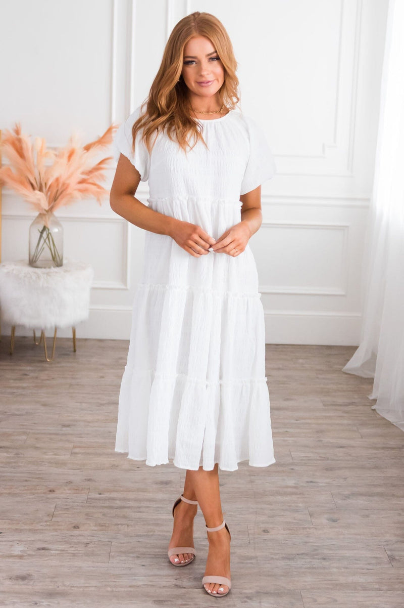 The Serena modest dress is perfect from top to bottom! We adore the gorgeous cloud white color, tiered skirt, high rounded neckline, and ruffled detailing on the skirt! This gorgeous dress is seriously perfect for spring, grab yours today!