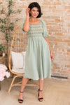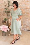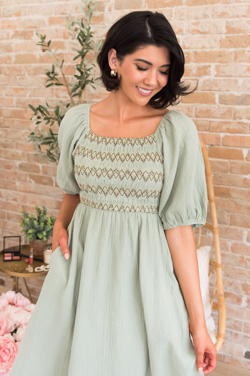 Don't wait on this dress, it will sell out in a flash and is truly as lovely as they come. Our pretty, sage Shadia dress features a flattering embroidered smocked bodice, squared neckline, short puff sleeves, pockets and a flowy skirt. Act now, these won't last long!