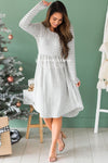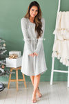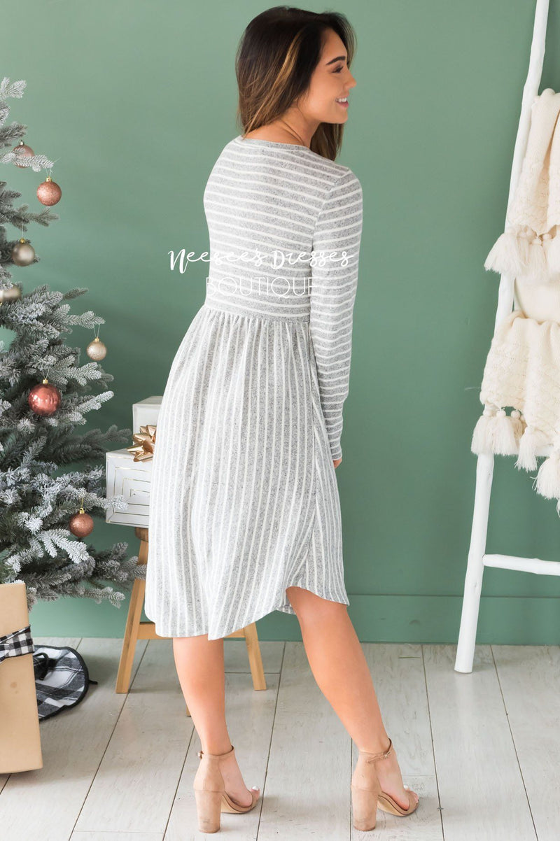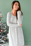 Our Shaliya is the perfect transitional piece to have hanging in your closet! The material is so soft, making it perfect for chilly weather. Plus, how perfect is the grey and ivory striped material!? This dress features long sleeves, a round neckline, elastic waistband. Pair this with your favorite jean jacket and you are set to take on the day!