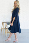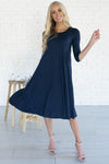 Swing into fall with this gorgeous flowy swing dress! The Shannan has the perfect hue for fall and winter. Featuring rounded pleated neckline, 3/4 length sleeves, swing style skirt. Get yours quick, we promise these won't last long!