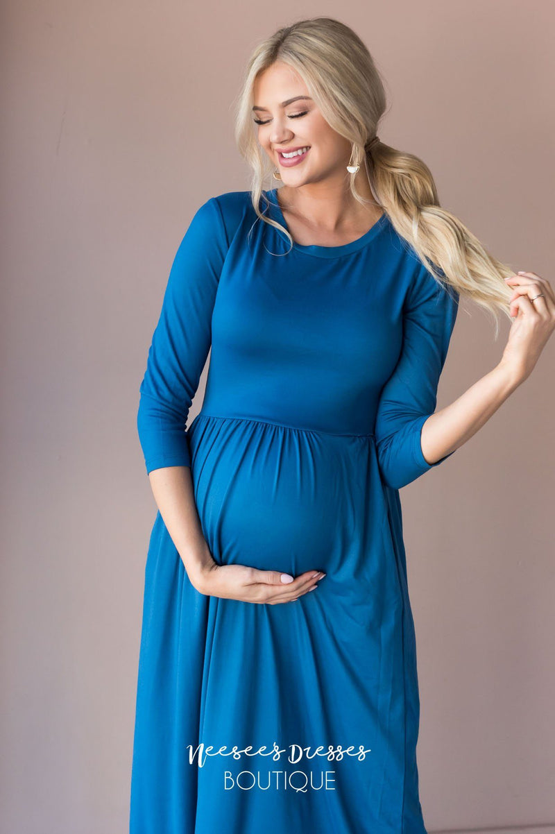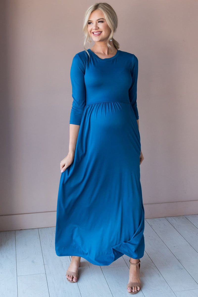 On the search for the most amazing maxi?! The lovely classy Sharalee is it! Perfect to wear solo or to layer with all of your favorite accessories! Featuring a modest round neckline, 3/4 length sleeves, elastic waist, pockets and the loveliest flowy maxi skirt!