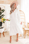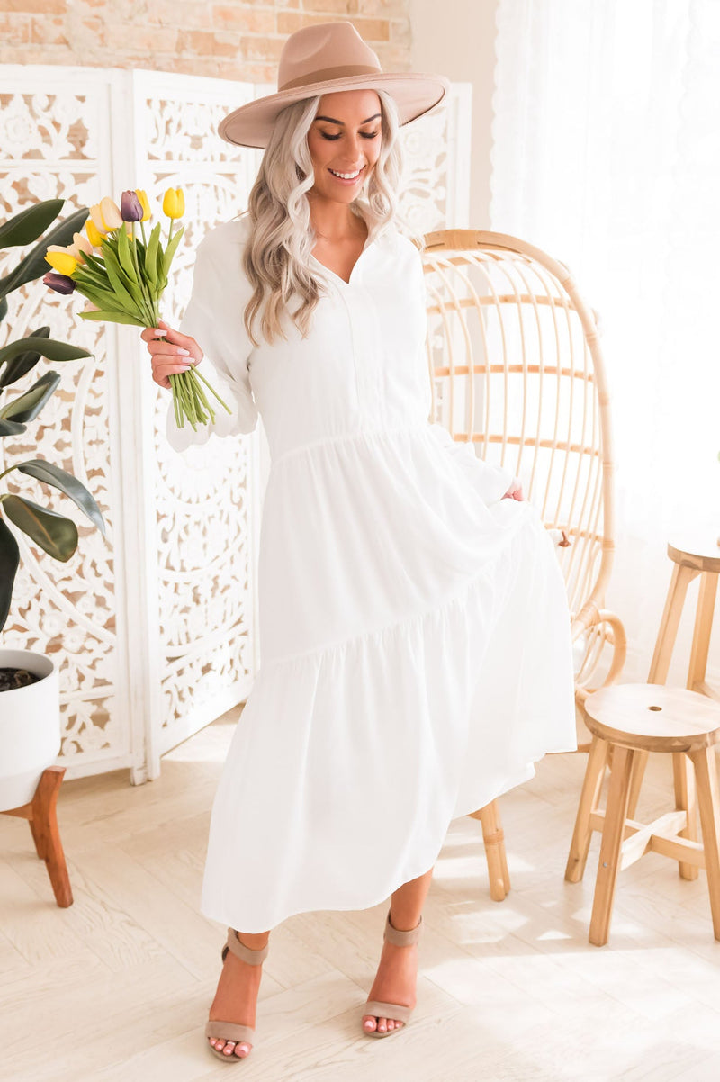 The Shari is as classy as they come! There is nothing not to love about this new flowy beauty. Featuring a darling collared v-neckline, long cuffed sleeves, a tiered high-low skirt. We are absolutely in love with this new arrival!