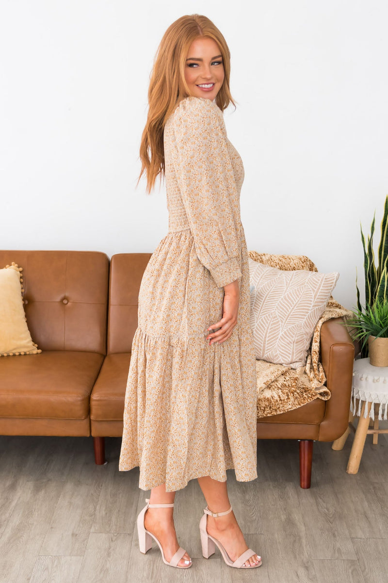Yes Please to the Sharidon! This fall must have is a must have! We are so happy to offer this lovely floral dress for you all! Featuring long puff sleeves, a darling smocked bodice, and lovely drop hem ruffle skirt. This is your next must have, trust us!
