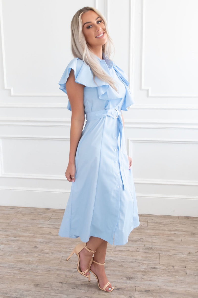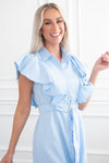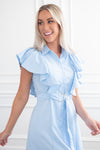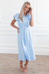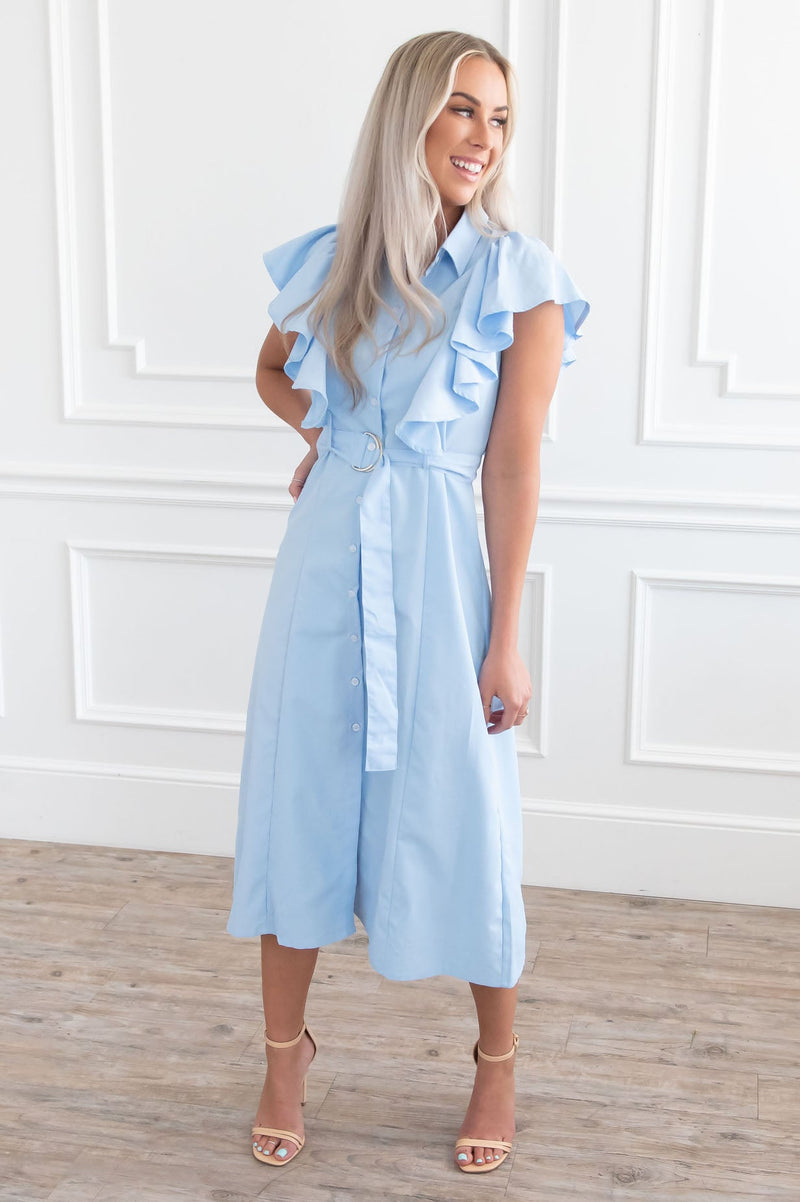 This lovely ruffle sleeve dress has got to be in your closet! We are loving the modest collared neckline, functional button front, belt tie waistline and perfect tea-length flowy skirt! Get yours today!