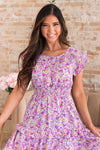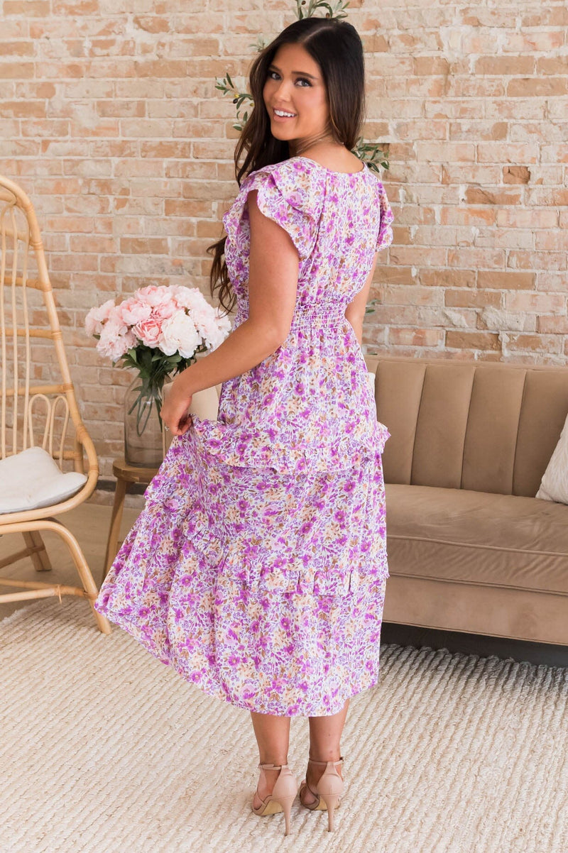 This lovely feminine lavender floral has got to be in your closet! The delicate ruffled details are flattering to every figure! Trendy smocked waistline and flowy ruffle tiered skirt is a true must have! Get yours today!