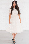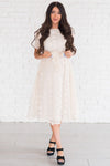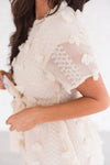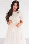 Wow! This dress is absolutely fabulous from the pom-pom fabric, the cloth overlay and tie waist are perfect together! We know this dress will be a fan favorite due to the lovely modest fit and the texture details throughout the gown!