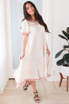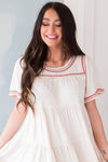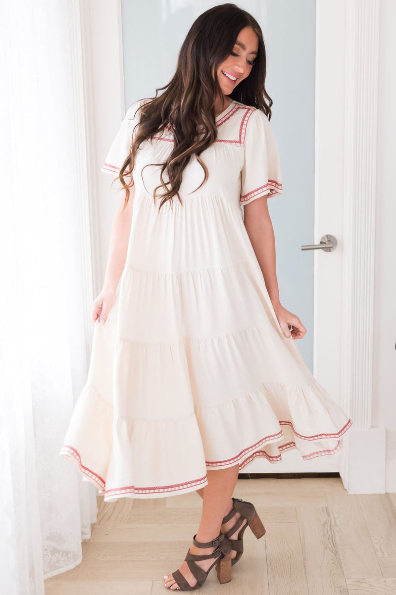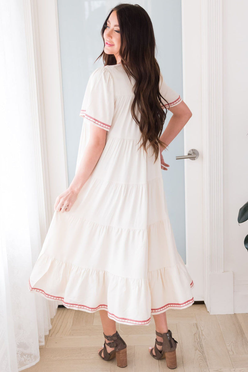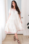 This fabulous dress is just amazing! It features a tiered design and elegant bell sleeves, as well as a beautiful cream color. It also has a gorgeous rose and light pink embroidered hemline on the neckline, skirt, and sleeves. Every wardrobe needs this elegant dress for summer!