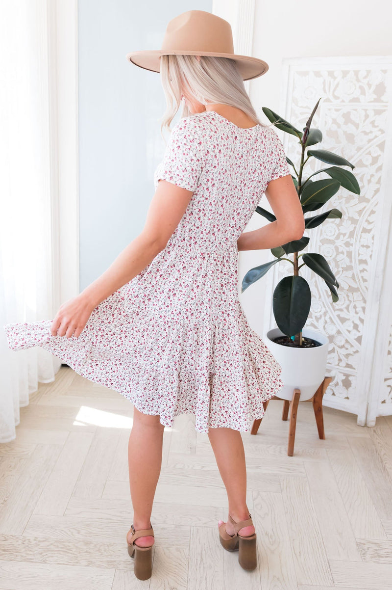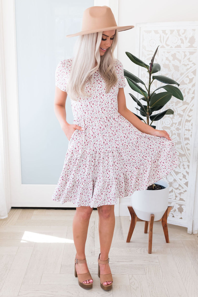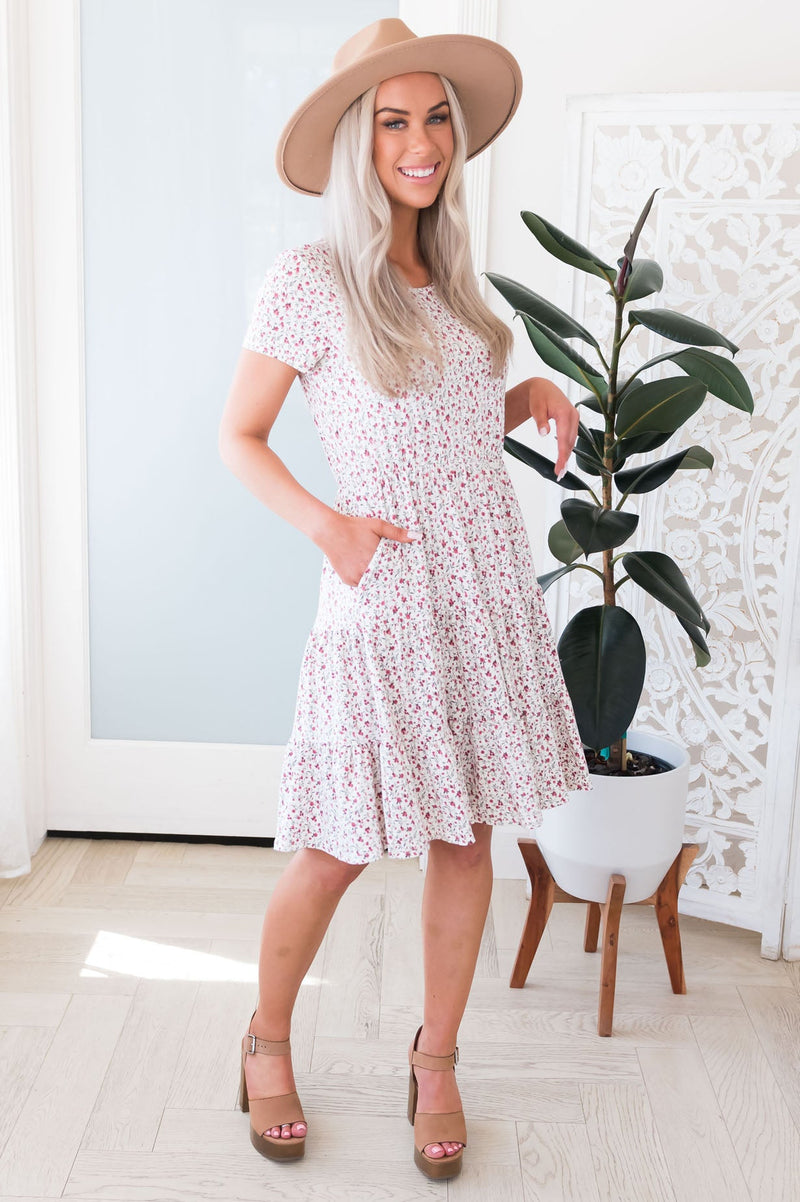 This modest floral has yet again stolen our hearts! We are obsessed with the lovely yet oh so delicate color combination! Features include short fitted sleeves and bodice, pockets tiered skirt and slip on fit. Get yours today!