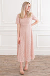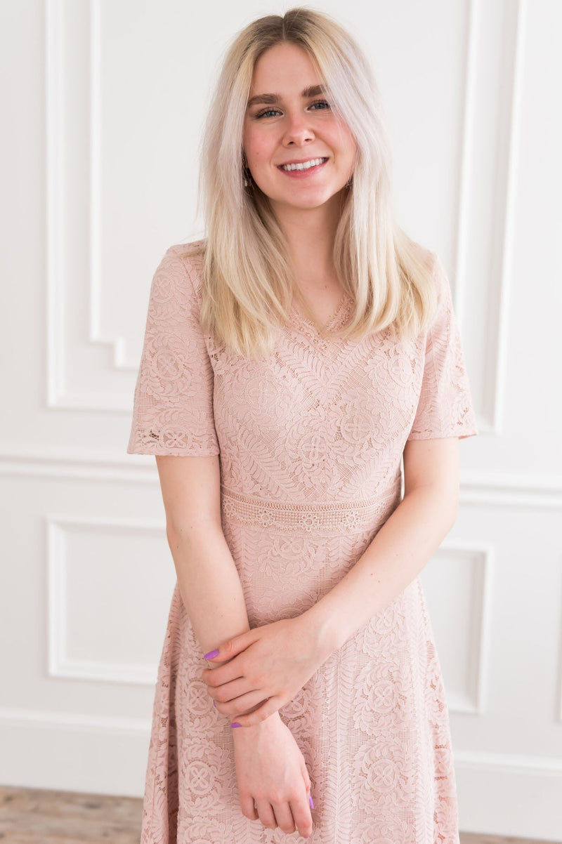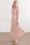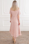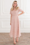 This Siya Dress is absolutely spectacular from the lace overlay to the darling soft v-neckline! This delicate feminine lace dress features short sleeve and tea length skirt is perfect for any special occasion! The circular lace design will take your breath away!