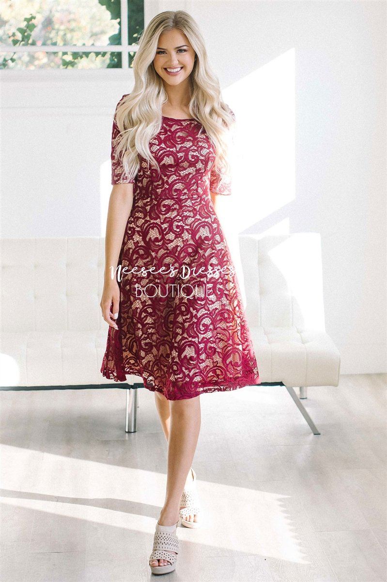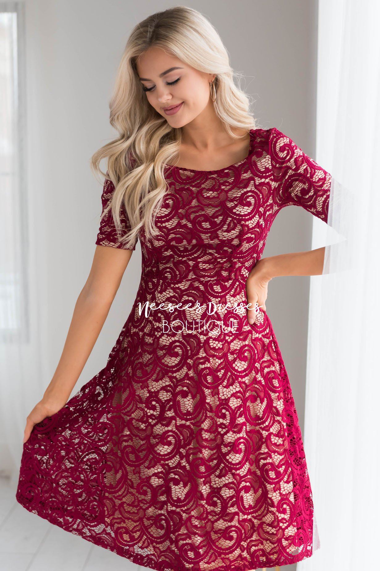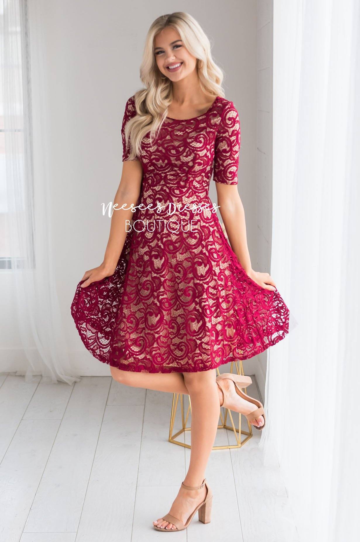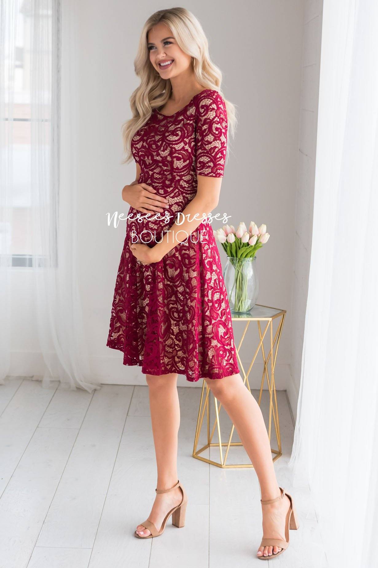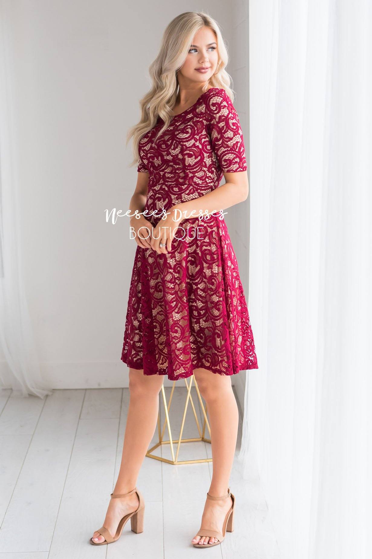 Who doesn't love an absolutely beautiful lace dress! This stunning burgundy lace dress features a contrast nude lining, half sleeves, a round neckline and princess seams. The romantic dress will not disappoint and is forever timeless! Has back zipper closure. Belt and accessories not included