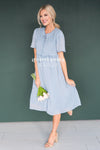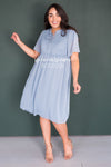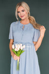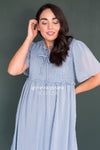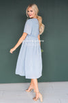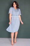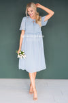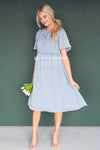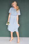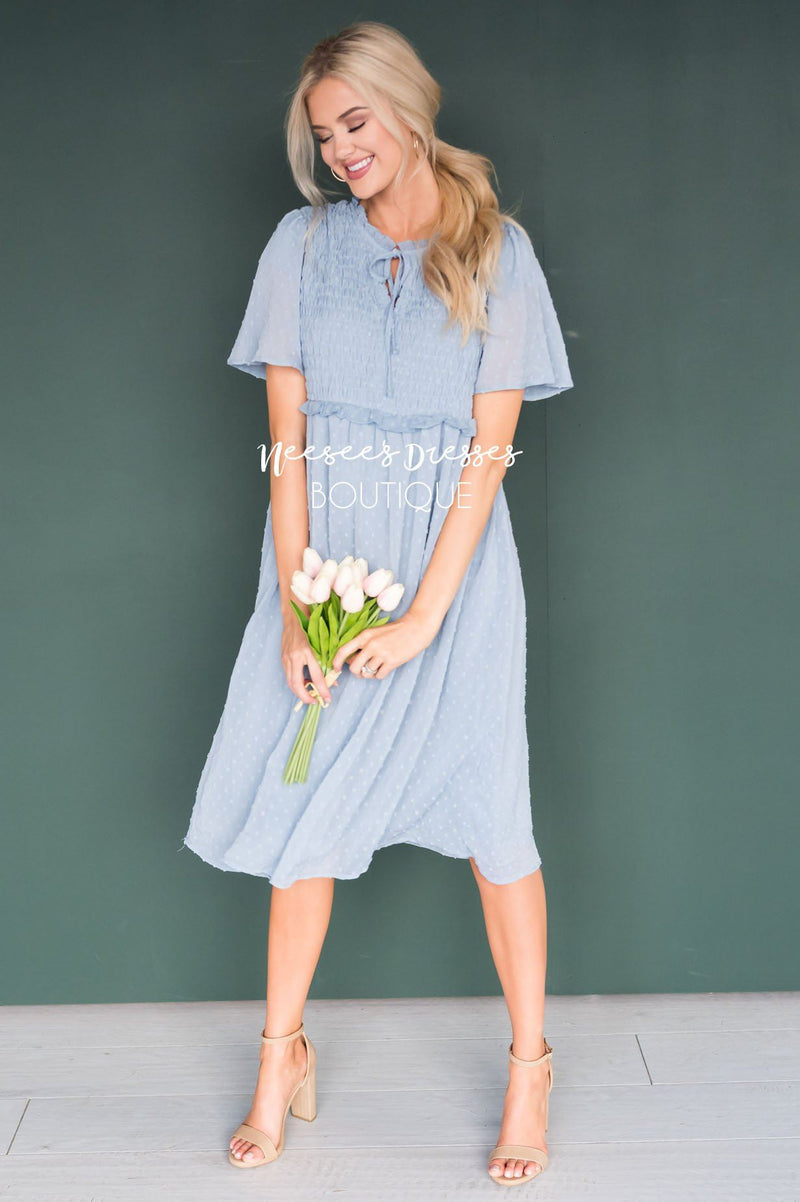 We are loving the gorgeous dusty blue swiss dot mid-length dress! So fun and classy at the same time. Featuring a elegant shirred bodice with neck tie, elastic ruffle waist, and last but not least elegant soft flowy material.