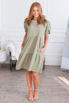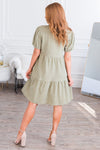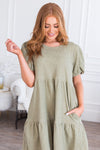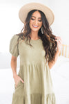 We fell in love with this darling light olive dress the moment we saw it! With amazing features such as the stunning short puff sleeves, babydoll fit, pockets and flowy tiered skirt! Get yours today!