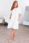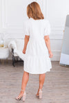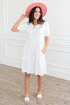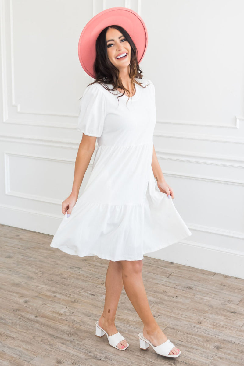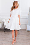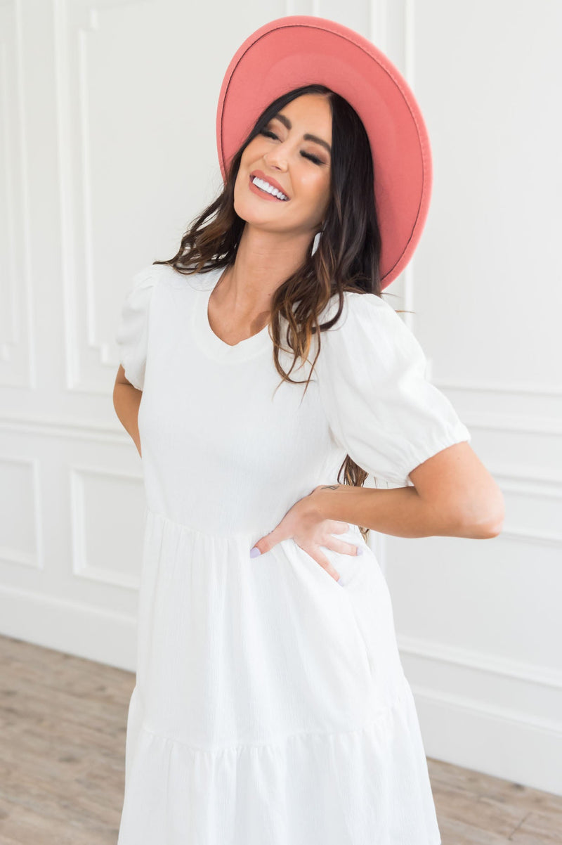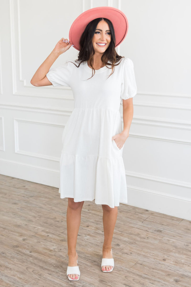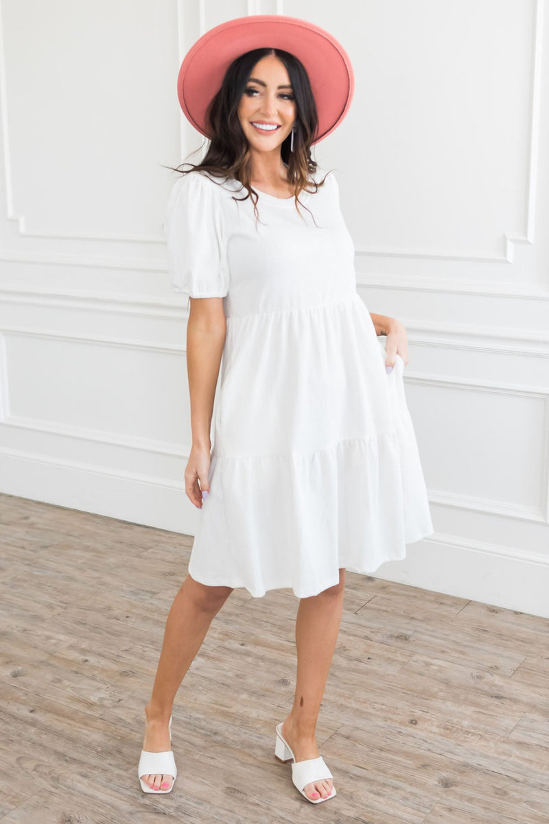 We fell in love with this darling ivory dress the moment we saw it! With amazing features such as the stunning short puff sleeves, babydoll fit, pockets and flowy tiered skirt! Get yours today!
