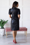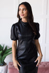 You never have to sacrifice modesty for style at NeeSee's! The fashion forward Solene is a Fall must have! This ready for anything dress has all the best features to include, a round ruffled neckline, zipper back closure, short puff sleeves, flattering to all fit and faux leather look. Get yours today!