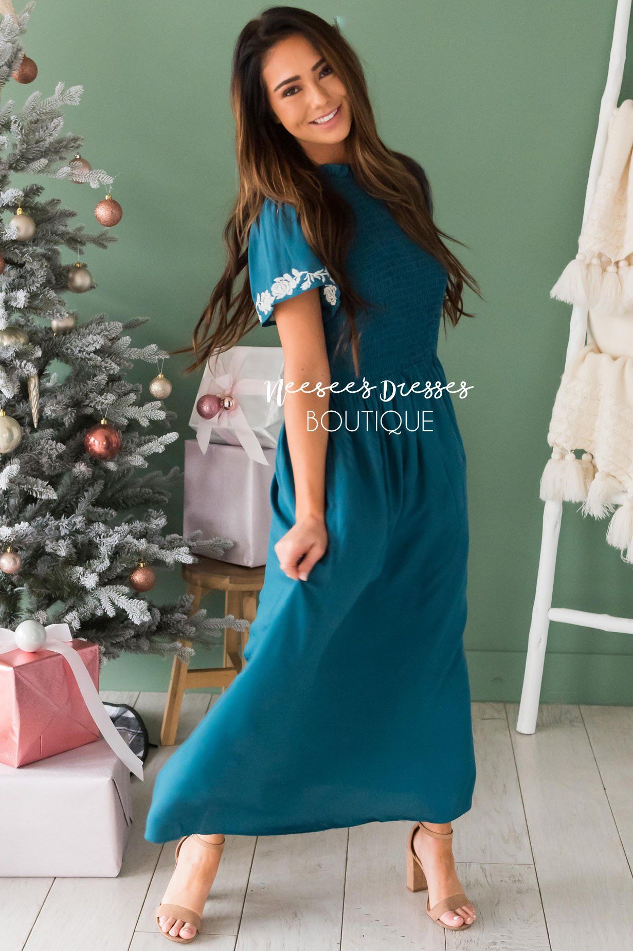 Our new Sophie dress is seriously perfection! We are loving the high modest neck line with ruffle detailing, it adds the perfect feminine touch. The shirred detailed bodice plus the short flutter sleeves paired with this stunning white embroidered detail on the sleeves creates such a classic timeless look. This dress is also lined.