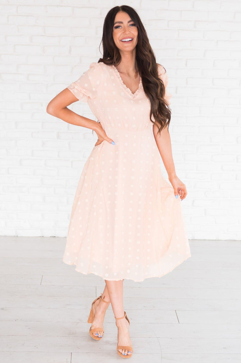 Guess what?! Your new favorite swiss dot dress has arrived and we are so excited! Featuring such a classy feminine tiered flowy skirt, elastic waist, modest rounded neckline and short flutter sleeves. Get yours before they are all gone!