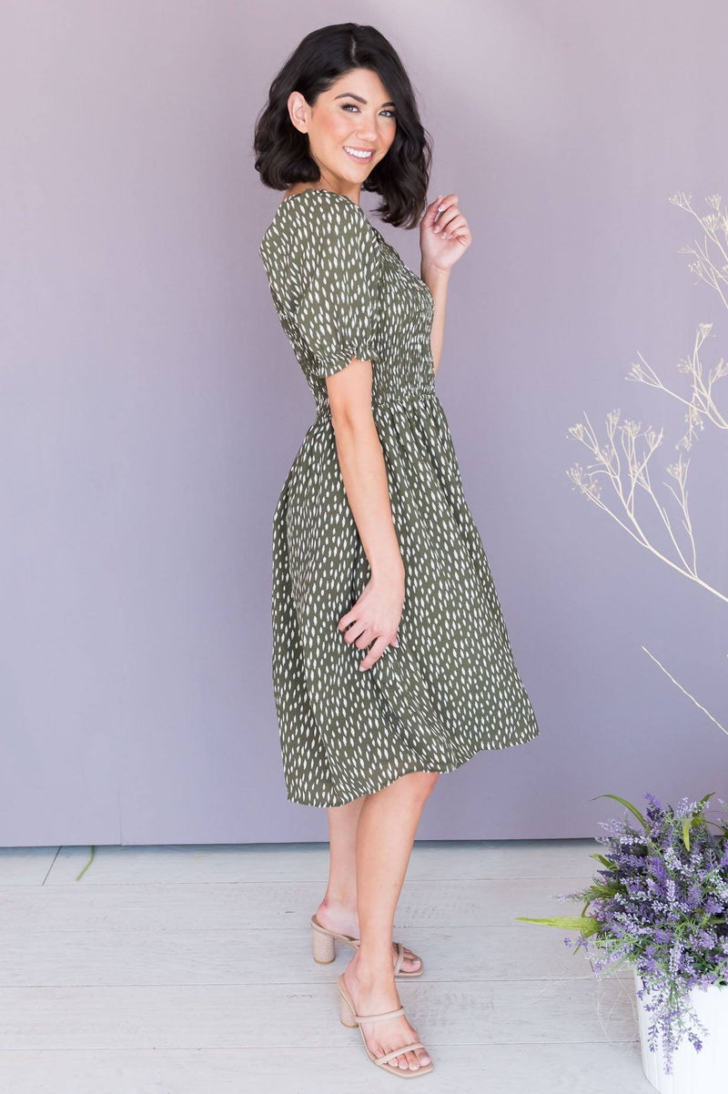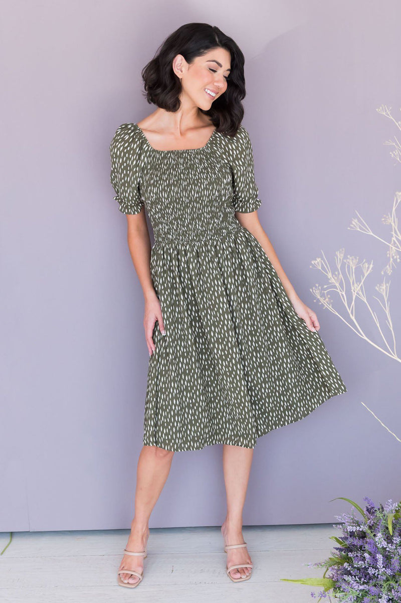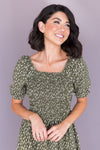 We are so excited about The Spencer! This dress is so perfect for any occasion! We love the flattering all shirred bodice, short puff sleeves and the to die for olive & ivory abstract print! You will love this darling gem, get yours today!