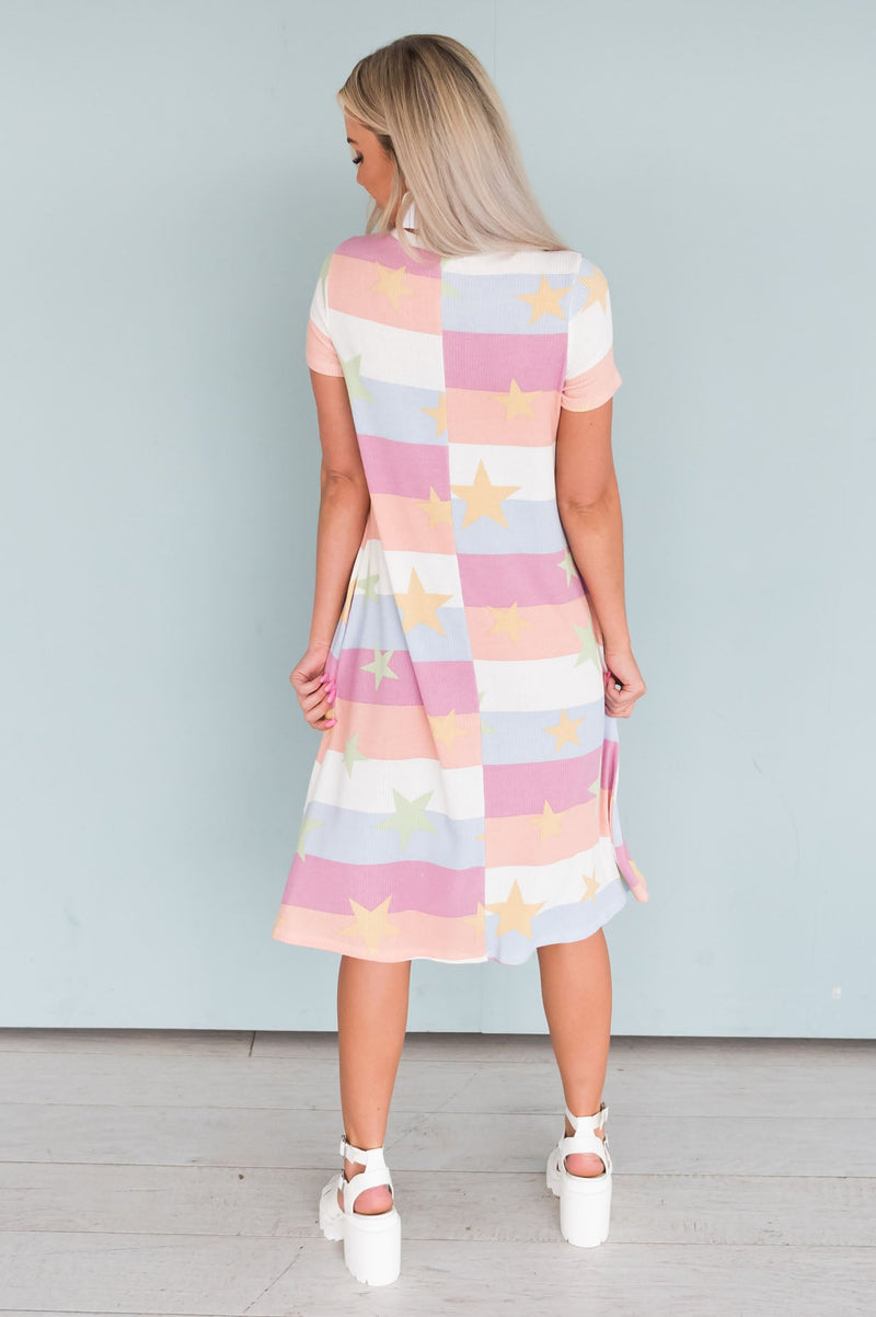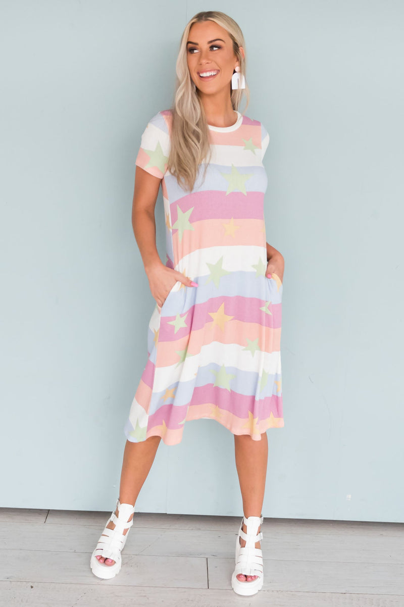 The Star has got to be the most fun swing dress we've ever brought to you! This adorable stars & striped swing dress features; shorts sleeves, round modest neckline, pockets, ribbed knit material, the perfect midi length. These beauties are going to fly out of our boutique faster than they came in so be sure to snag yours!