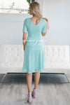 Who doesn't love an absolutely beautiful lace dress! This stunning mint lace dress features half sleeves, a round neckline and princess seams. The romantic dress will not disappoint and is forever timeless! Dress has stretch and slips on. Fully lined.