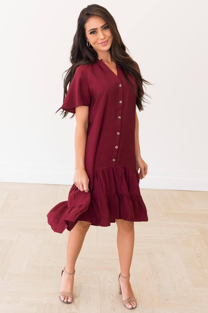 We are loving every beautiful detail about this new dress! The Stella dress features a v-neckline with functional button detailing, short sleeves, shift style cut and the most feminine double ruffle hemline. We also love the gorgeous rich burgundy color, perfect for fall! Get yours today!