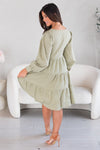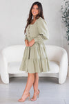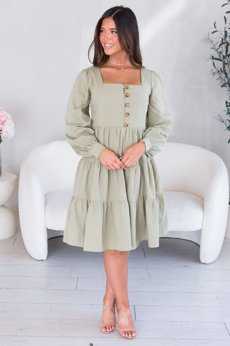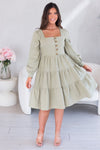 We are proud to bring the new Story! This darling twirl worthy dress is bound to make an impact! Features modest round neckline with functional button front bodice, long sleeves, and gorgeous flowy tiered skirt. Get yours today!