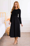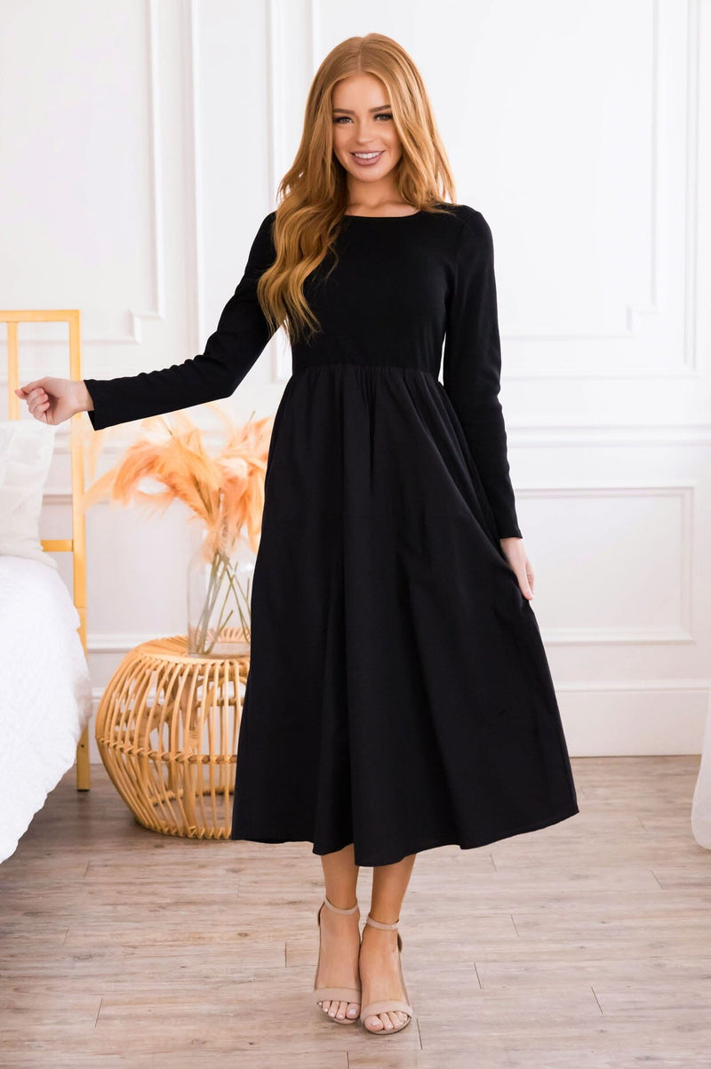 The dreamiest of dresses has just arrived! The Summit is what dreams are made of and is sure to sell out fast! Features include, classic black ribbed fabric, modest round neckline, long sleeves, pockets and flowy tea length skirt. We know you're going to love it!