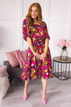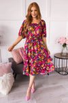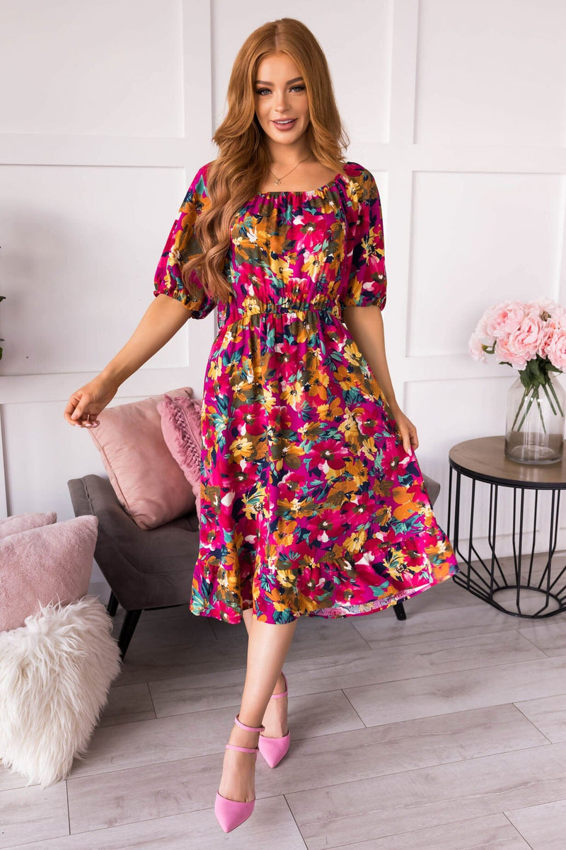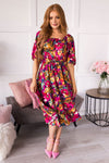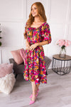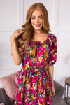This perfect floral beauty swooped in and stole our gaze! Featuring a slip on style, round neckline, half length sleeves, elastic waistline and twirl worthy skirt! Our favorite feature of all, the most gorgeous magenta floral!
