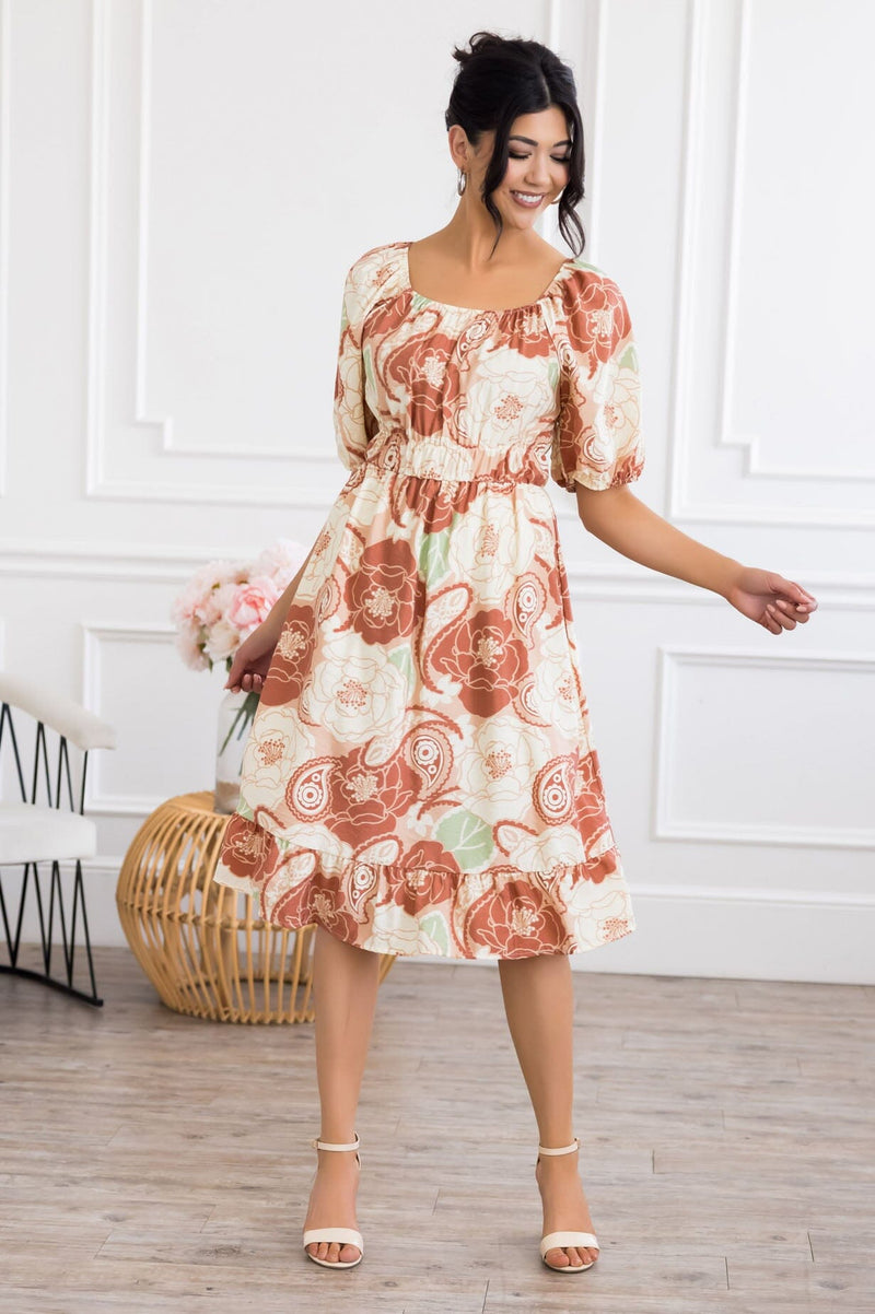 This perfect floral beauty swooped in and stole our gaze! Featuring a slip on style, round neckline, half length sleeves, elastic waistline and twirl worthy skirt! Our favorite feature of all, the most gorgeous cream floral!