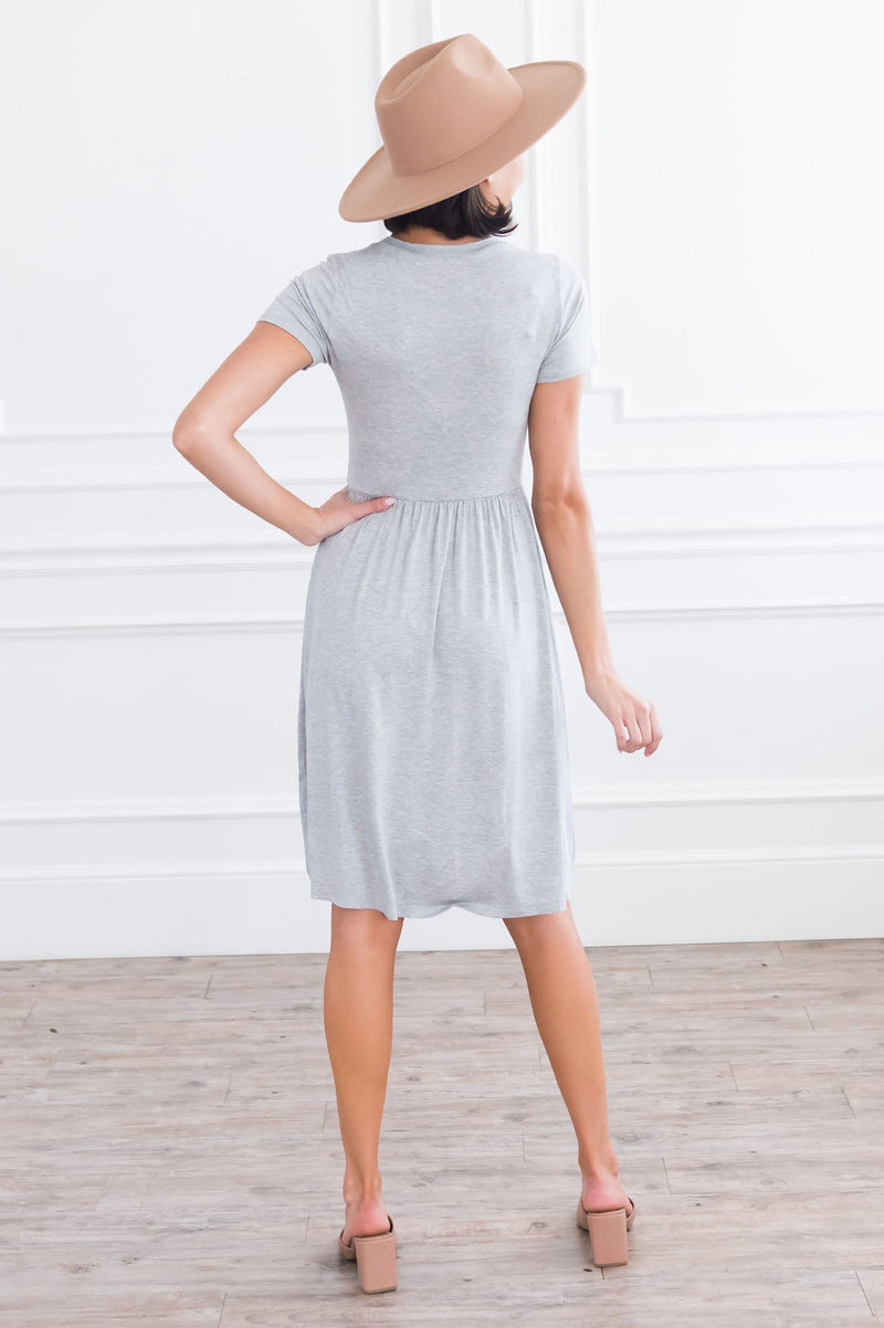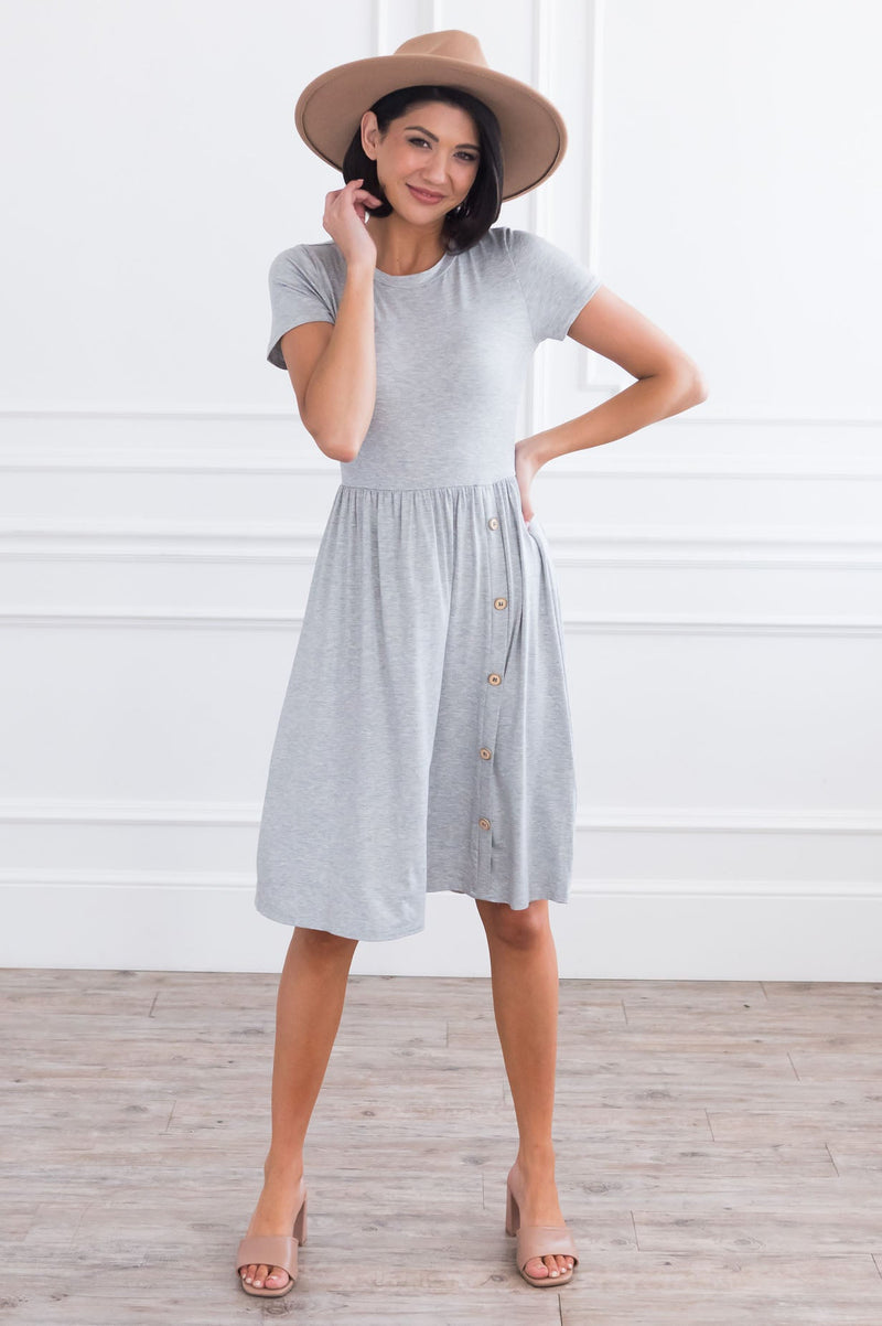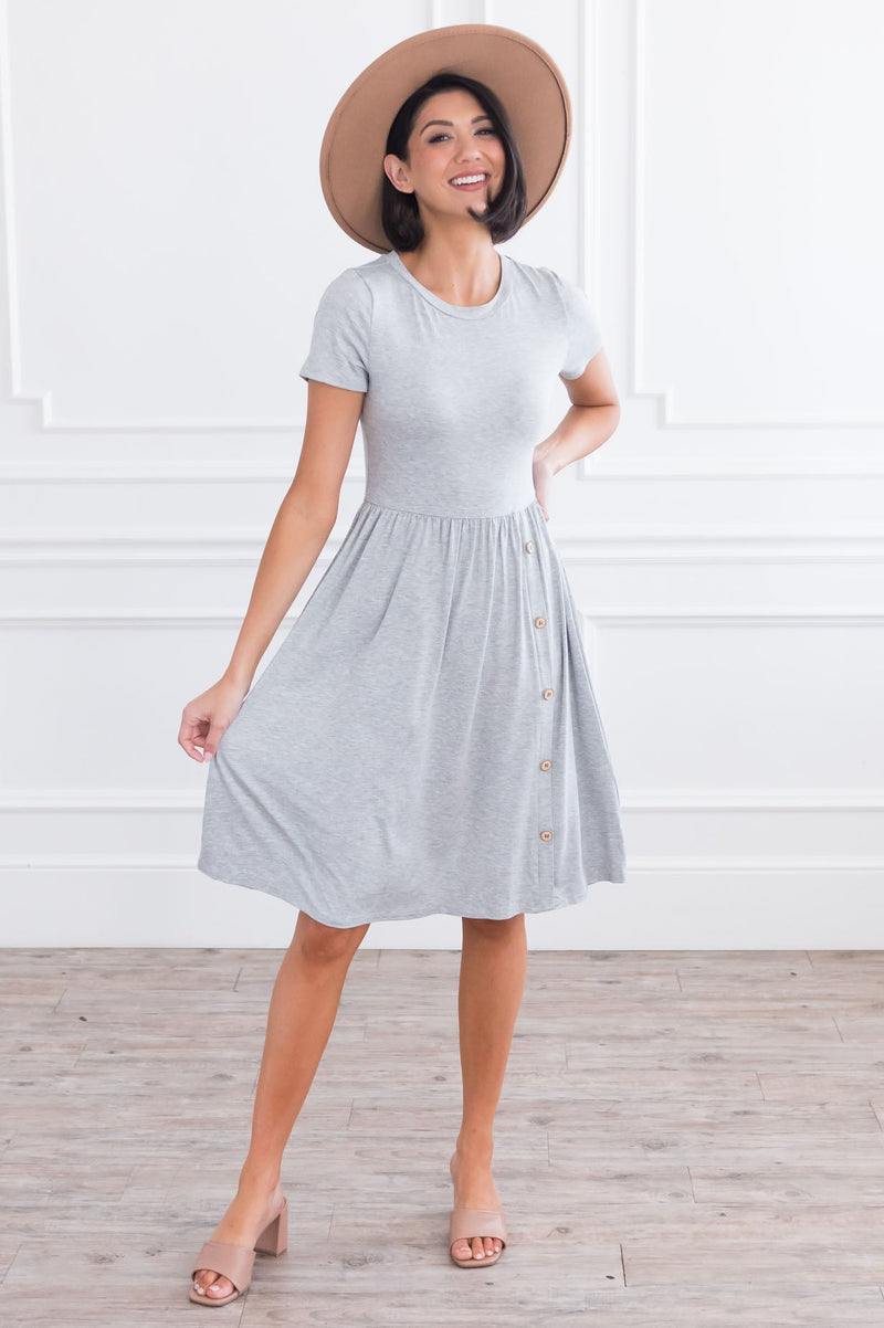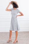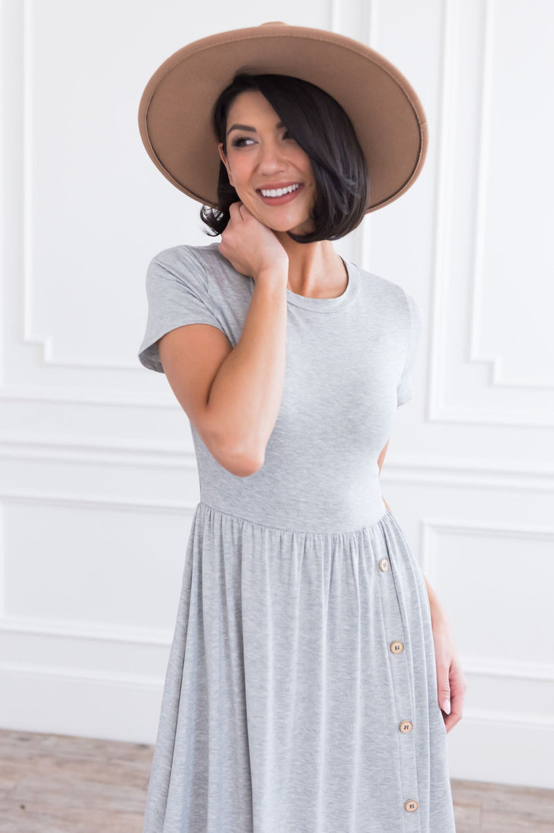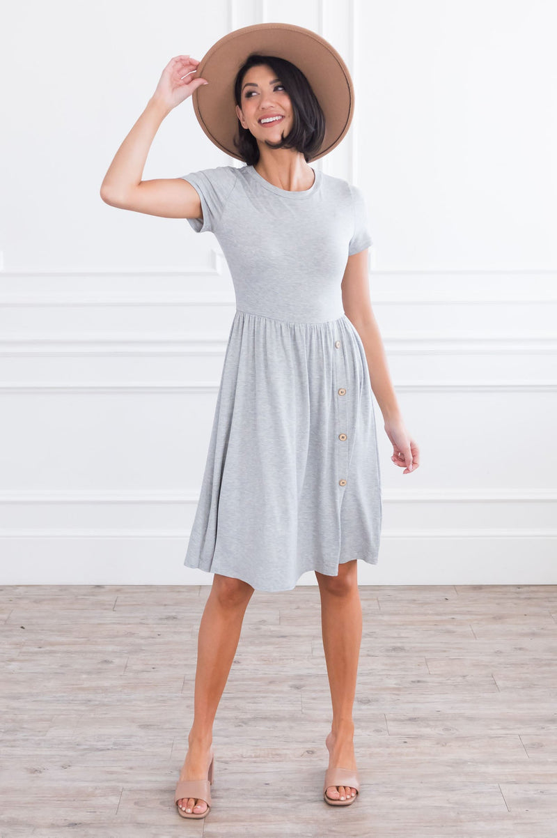 Simple yet stunning are two combos every woman needs! Having this basic flattering dress in your wardrobe is a must! This dress features short sleeves, round neckline, flowy shirt with the cutest side button faux button detail. Get yours today before they are all gone.