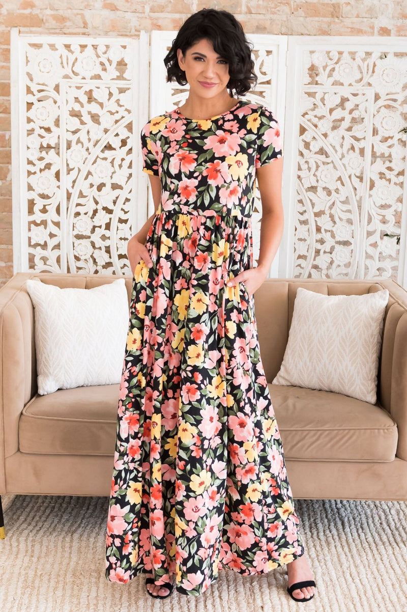 Say hello to this adorable, incredibly soft, always comfy, new dress! This modest, floral print, maxi dress is full of the cutest features, such as short sleeves, round neckline, elastic waist, and pockets. This maxi dress is easy to wear and perfect for being on the go!