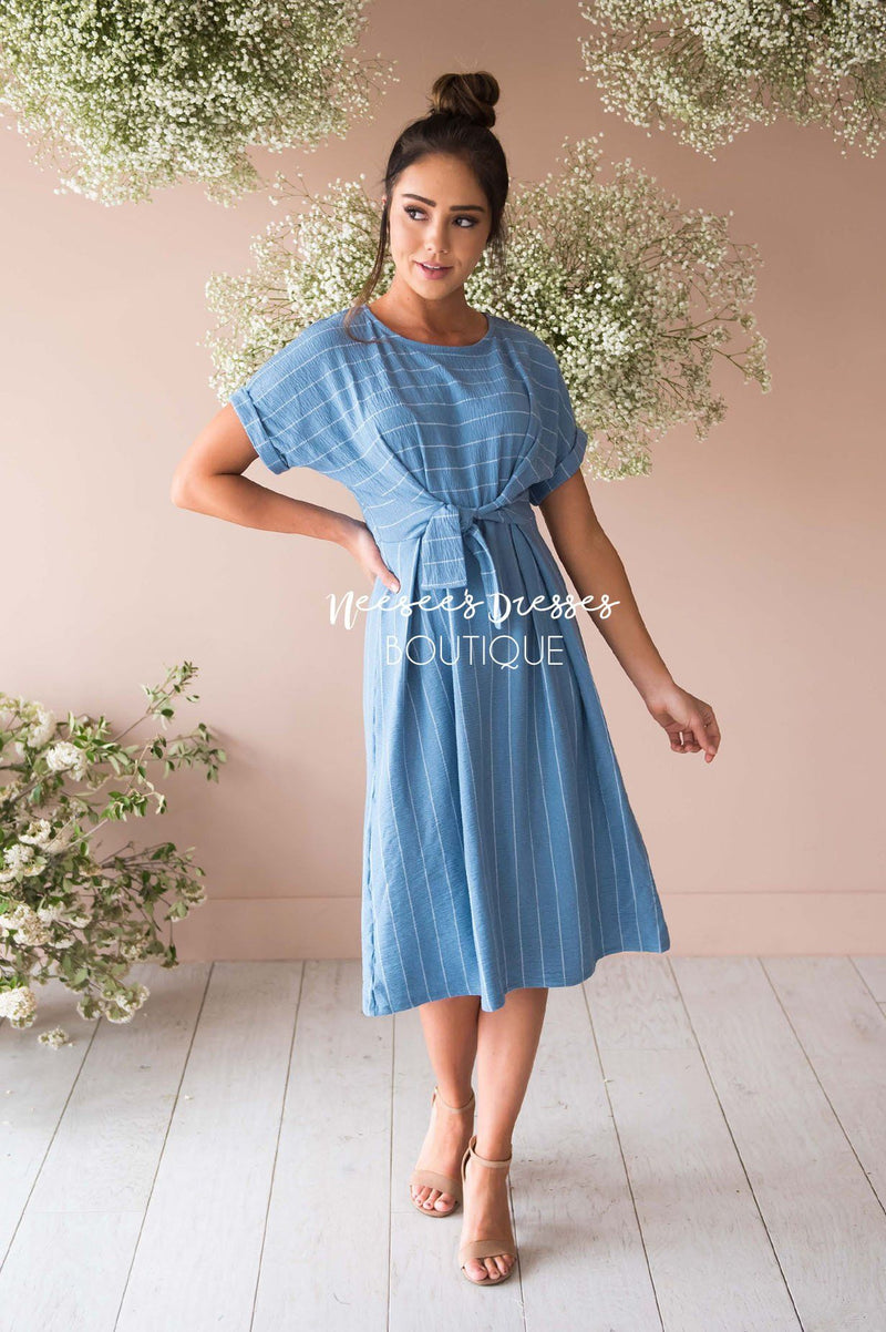 This new textured dress features dolman style cuffed sleeves a tie front waist, a key hole back detail and a beautiful cornflower blue color with thin ivory stripes!