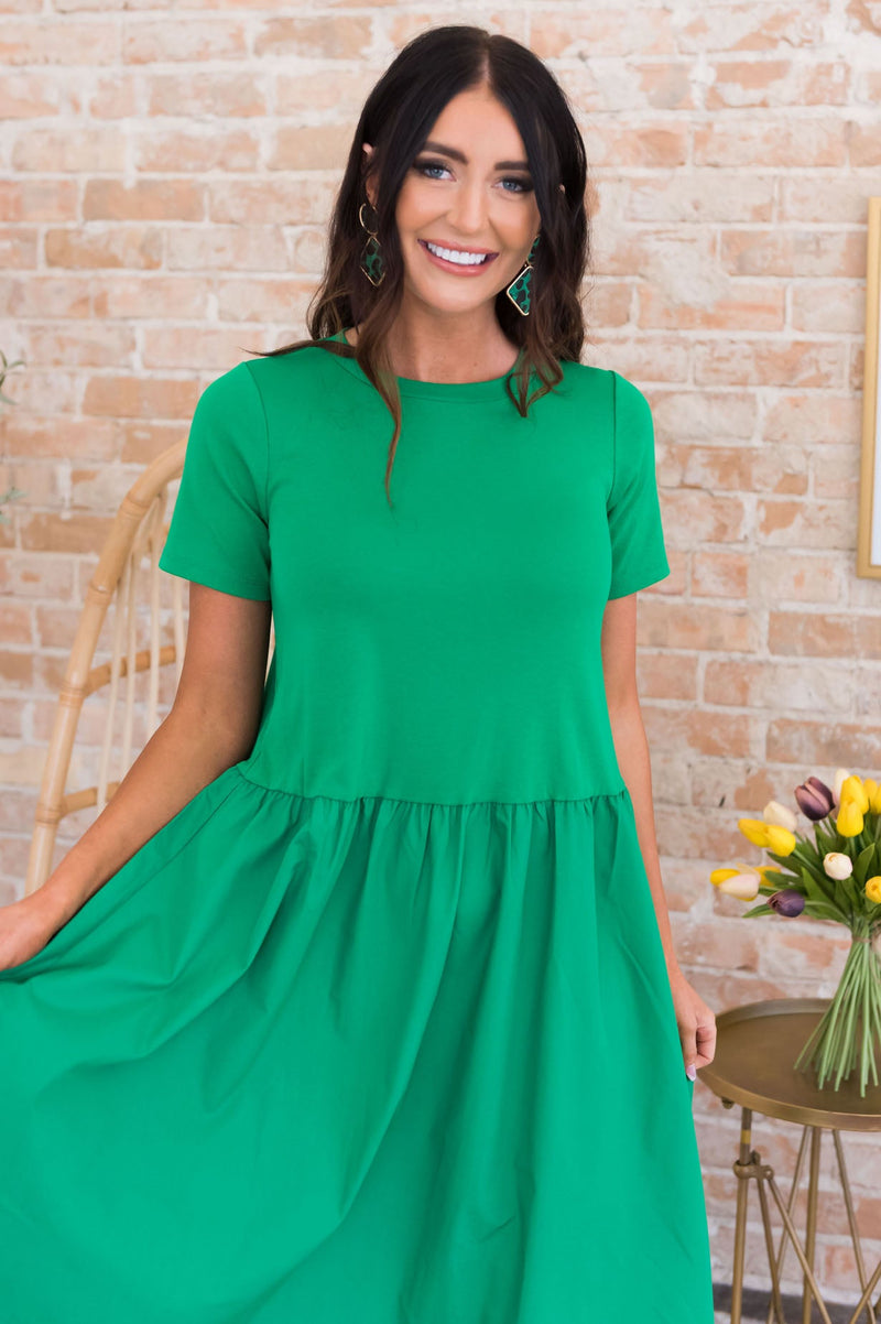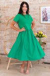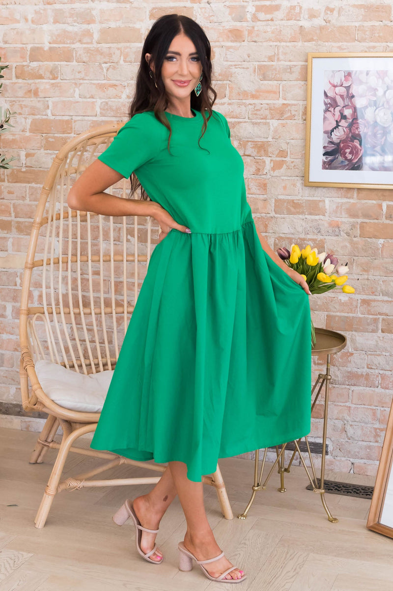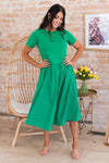 The Susana has all the most gorgeous features to include short fitted sleeves, dropped empire waist and the most darling flowy flared tea-length skirt. This modest beauty is a true summertime must have!