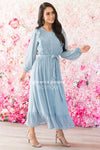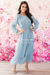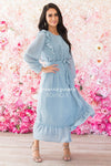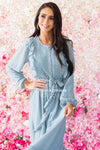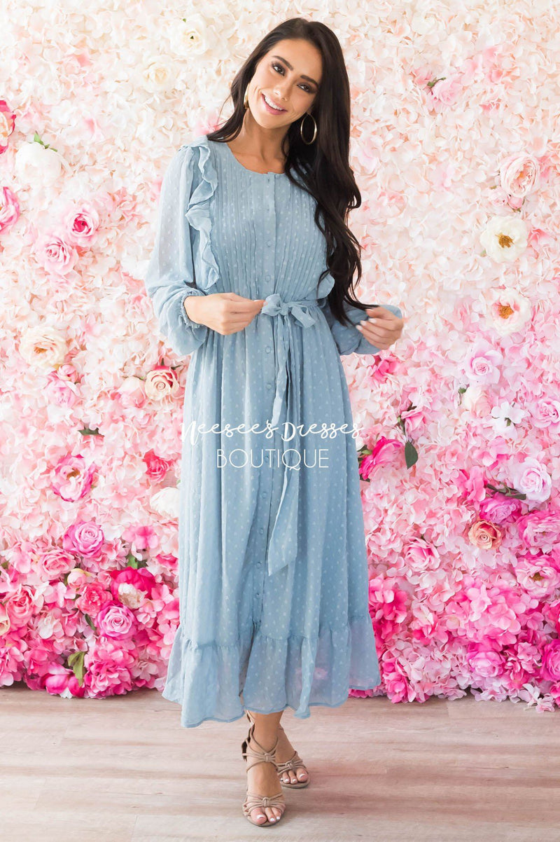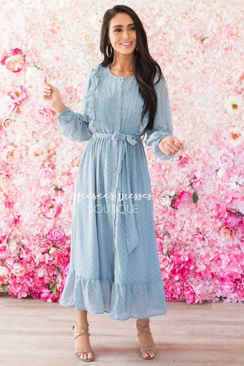 This darling feminine swiss dot beauty has stolen the show! We can not get over all the little details, we are in absolute love with this one! Featuring a pintuck bodice with ruffle detailing and a fully functional button front, long sleeves, belt tie waist and the perfect modest ruffle hemline. Get yours today!