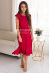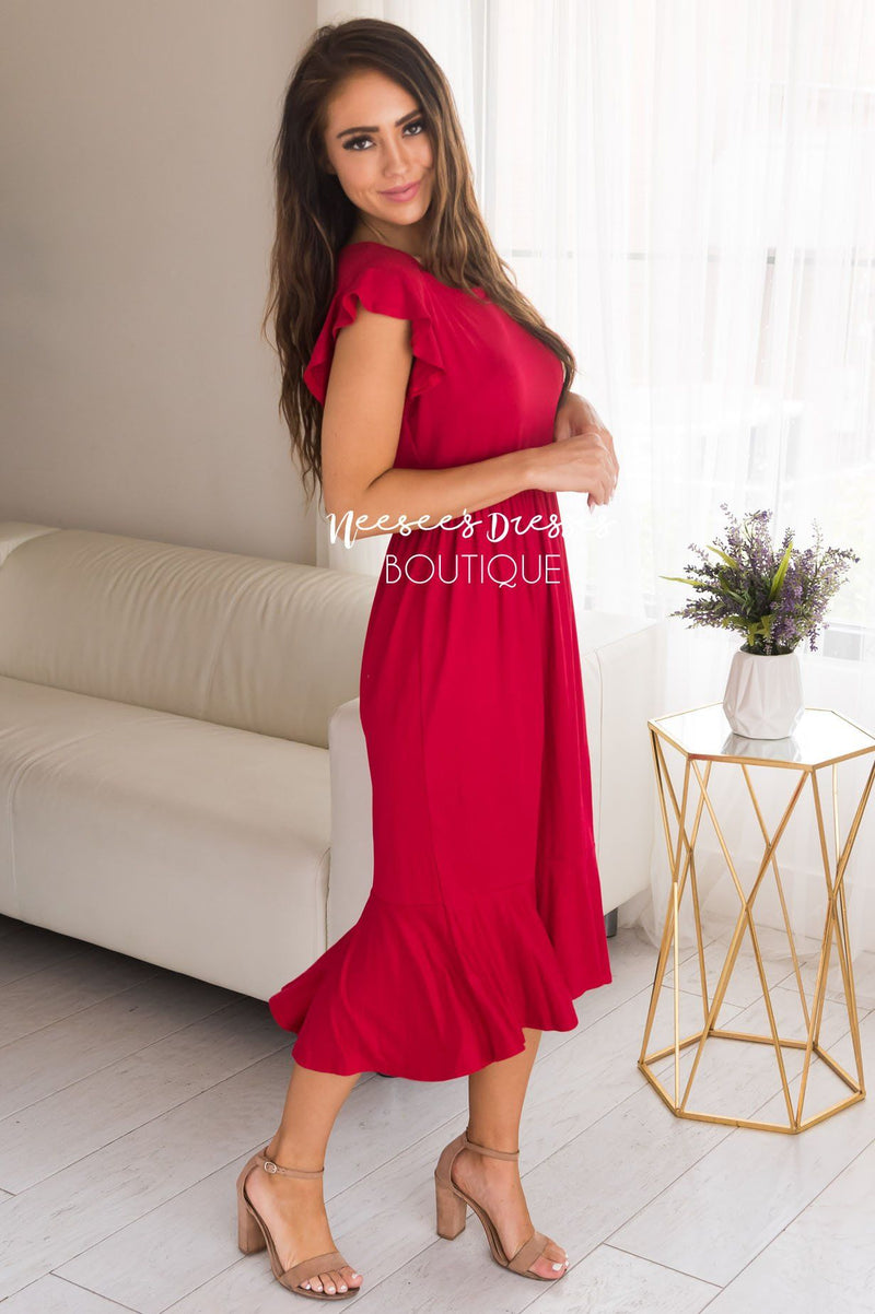 The Tabbie Modest ruffle dress has arrived for every single one of your summertime events! This cozy yet classy little gem has all the best features, to include, short ruffle sleeves, classic red color, empire waist and our favorite ever ruffle hemline! Get yours today!