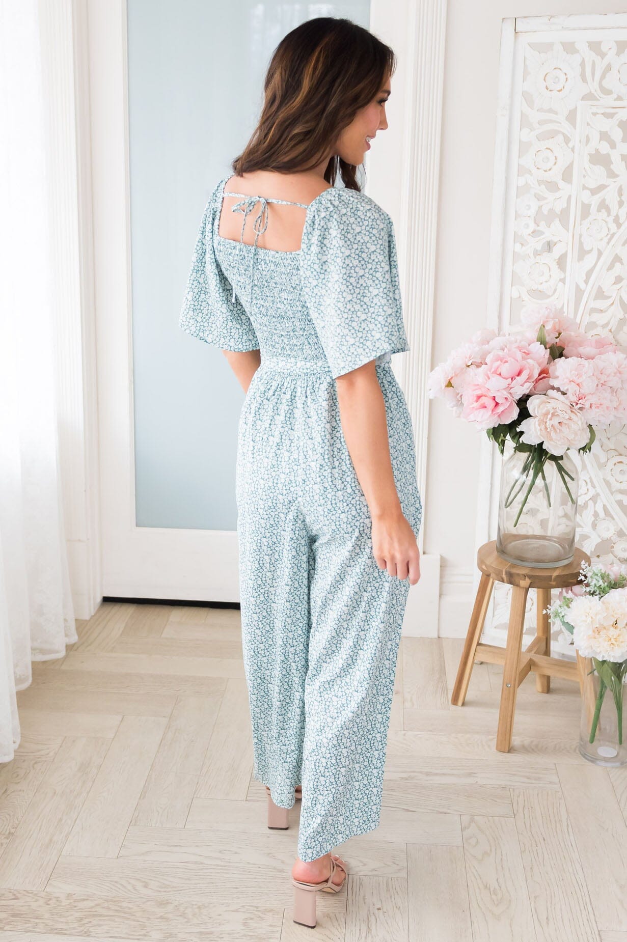 The Tabethia Jumpsuit is so fun and stylish, we are loving the smocked bodice and trendy sage floral print! Featuring a half length flutter sleeves, squared neckline with a feminine back tie detail and a belt tie waistline. This beauty is bound to be your perfect go to outfit!