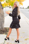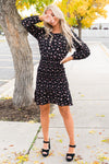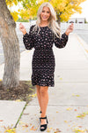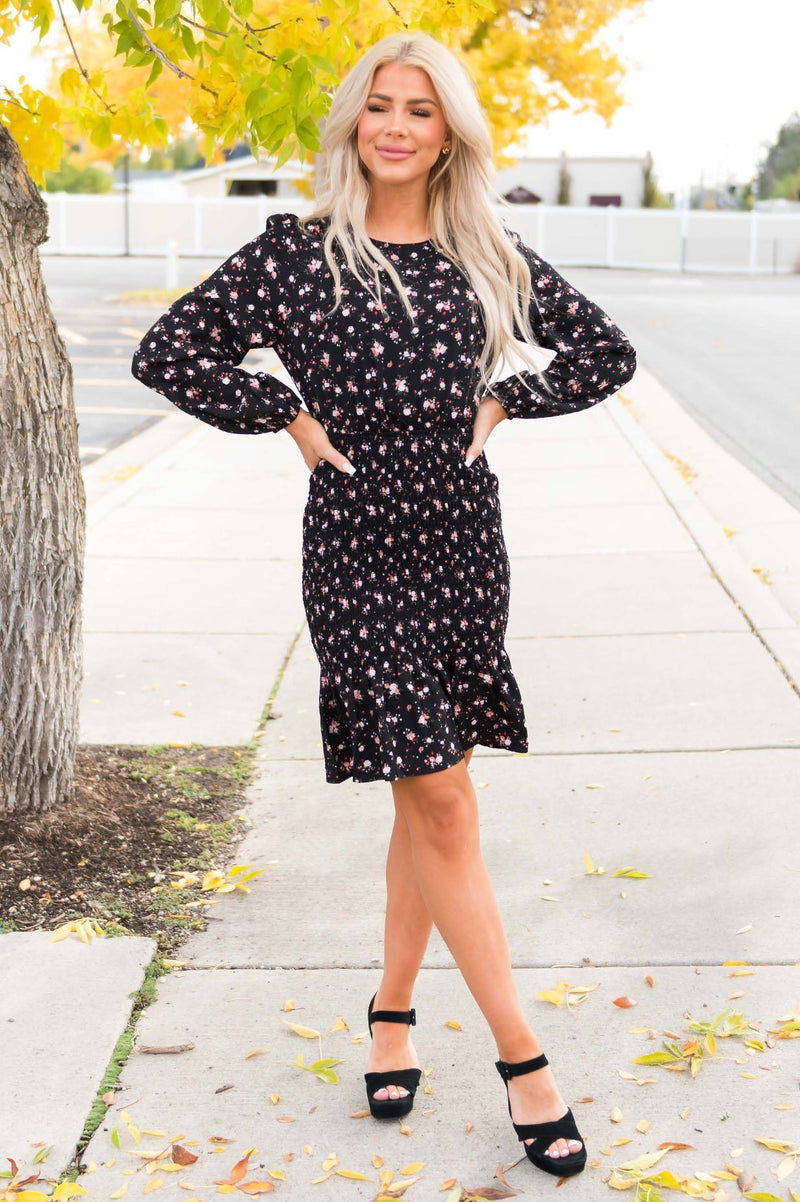 The gorgeous Tahliah has arrived just in time for winter! The sleek black color is the perfect pairing with the gorgeous rose pink floral throughout! We are loving the long sleeves and the beautiful smocked skirt with ruffled hem! You cannot go wrong with this one, get yours today!